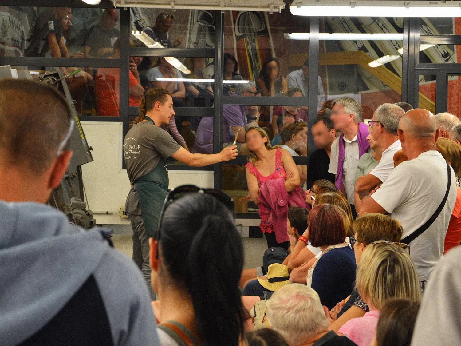 Im ersten Teil, sitzend in einem klimatisierten Amphitheater, erfahren Sie mehr über die Geschichte des Laguiole-Messers, über „echte Fälschungen“, das Schärfen… (mit Fragerunde). Im zweiten Teil gehen Sie in die Werkstatt, wo ein Messermacher vor Ihren Augen den Griff eines Laguiole-Messers formt. Ganzjährig, Montag bis Samstag: Führungen zu folgenden Zeiten: 11:00 Uhr – 14:30 Uhr – 15:45 Uhr – 17:00 Uhr (für Sonntage und Feiertage kontaktieren Sie uns bitte).Mit mehr als 10 Erwachsenen: vollständige Führung durch beide Teile. Mit weniger als 10 Erwachsenen: Führung + Video. Mit weniger als 6 Erwachsenen: nur Video.