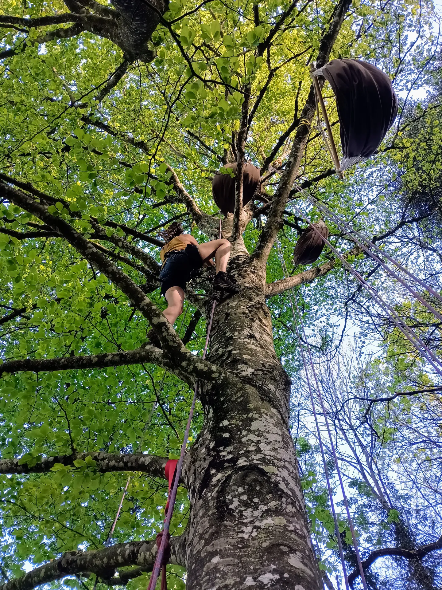 First steps, learning different rope techniques, exploring the vegetation from the roots to the top (no obligation to go all the way to the top, the participant chooses his or her maximum height). Movements in the tree. Notions of dendrology