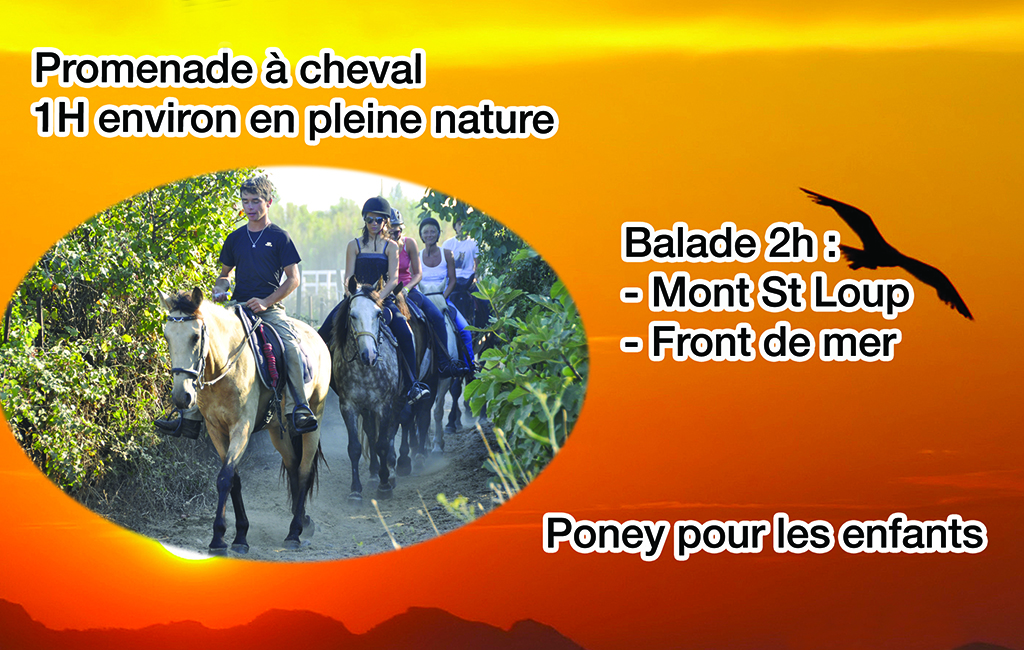 Promenades à cheval en pleine nature, le long de la plage ou au Mont Saint-Loup, pour tous les niveaux.