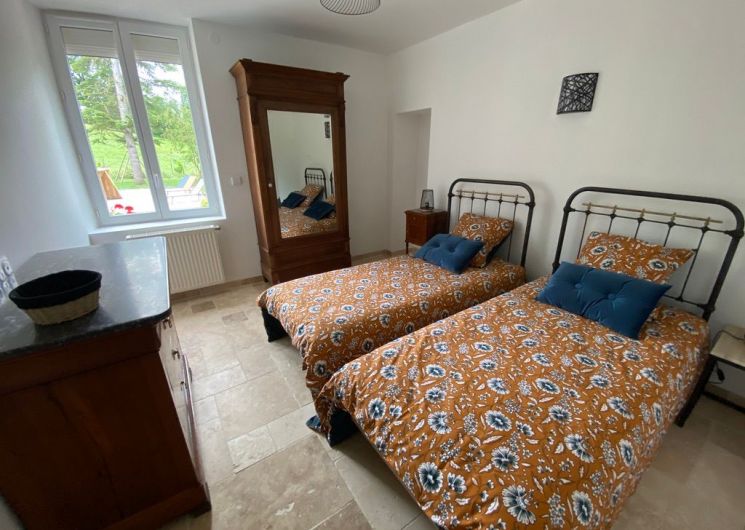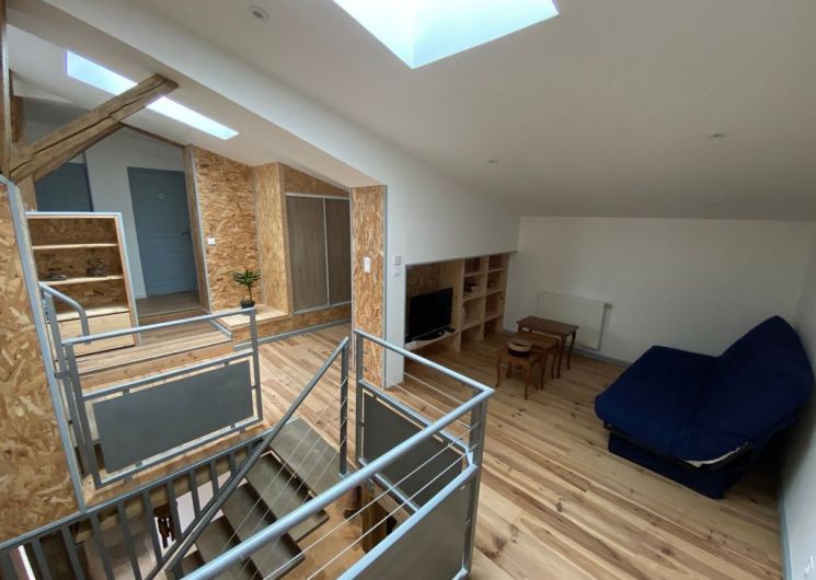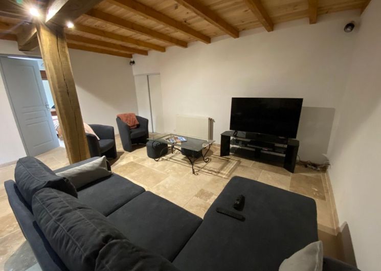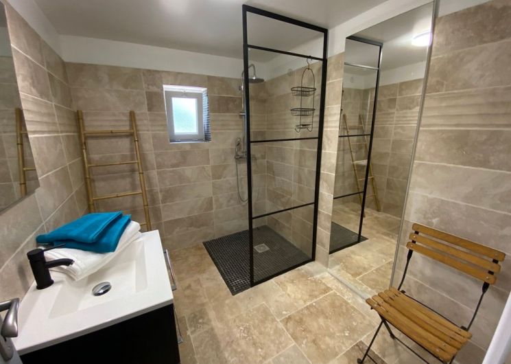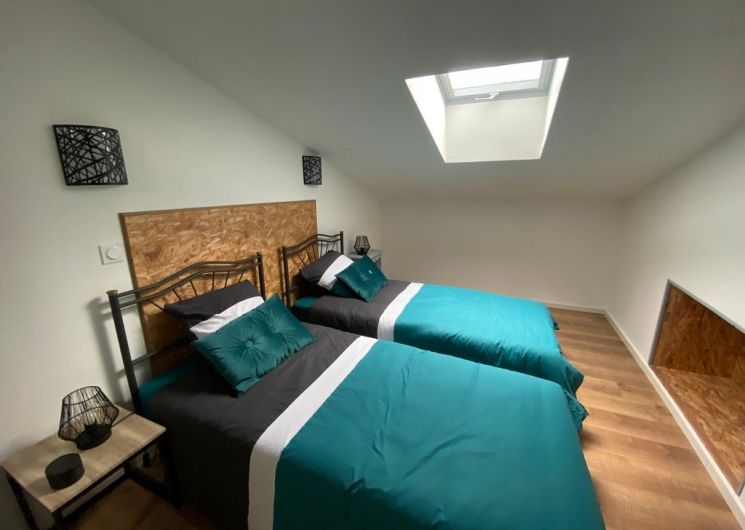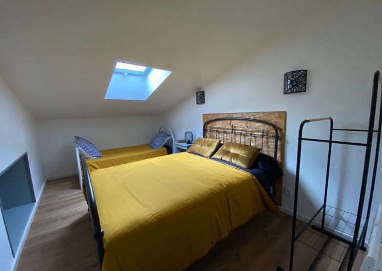 The ground floor comprises a living room with fitted kitchen (fitted units with dishwasher, fridge, freezer, microwave, hob and oven), a dining area (table and chairs), opening onto a lounge (corner sofa and two armchairs and two footstools, TV). There is a bedroom (2 x 0.90cm beds), a shower room (walk-in shower, 1 washbasin) and a separate toilet. Upstairs, a large mezzanine with a study area, an additional sitting area (TV and sofa), 4 steps to the bedroom (2 single beds), 2 steps to the bedroom (1 double bed and 1 single bed), 3 steps to the bathroom (double shower), a separate toilet and a bedroom (1 single bed). The 3 upstairs bedrooms have velux windows and blackout blinds. Wifi in the accommodation. Sheets and towels provided as an optional extra.