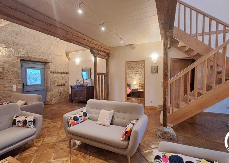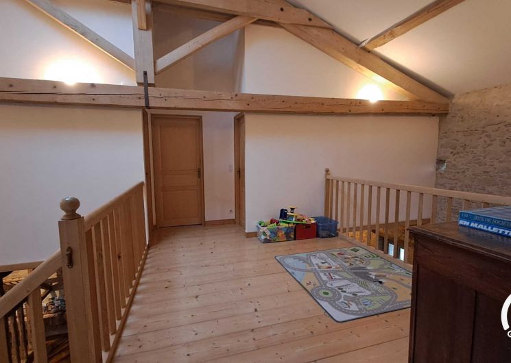 Grande maison de 200m² aménagée dans l’ancienne étable d’un corps de ferme traditionnel. Vaste jardin de plus de 2000m² qui donnent ensuite sur des champs céréaliers, jeux pour enfants, grande terrasse couverte avec barbecue au charbon de bois, salon de jardin, belle piscine chauffée et privative de 5m x 10m. Profondeur de la piscine : 1,10m jusqu’à 1,80m avec marche plage pour les plus petits.