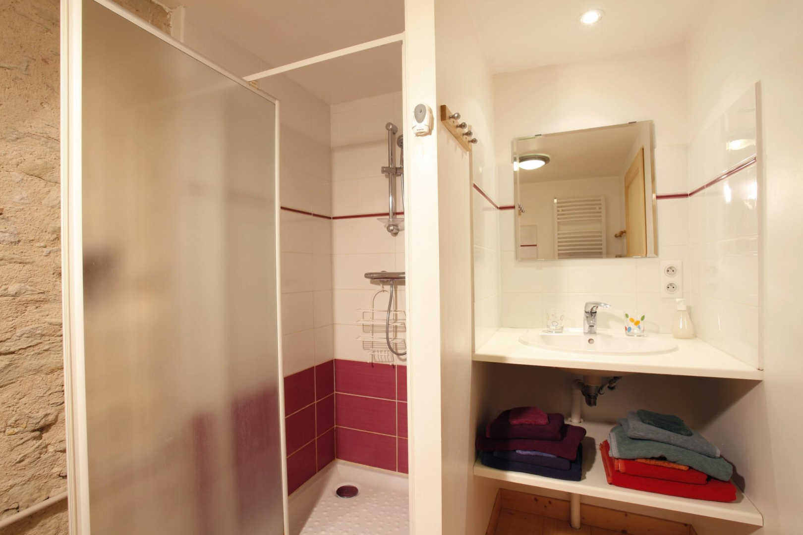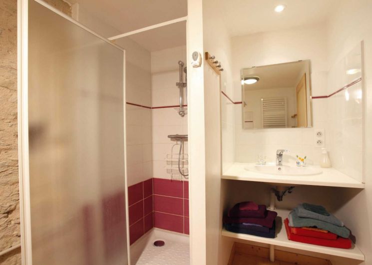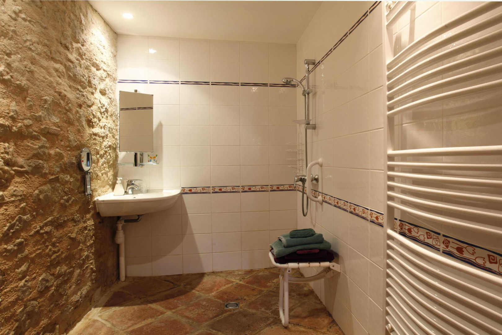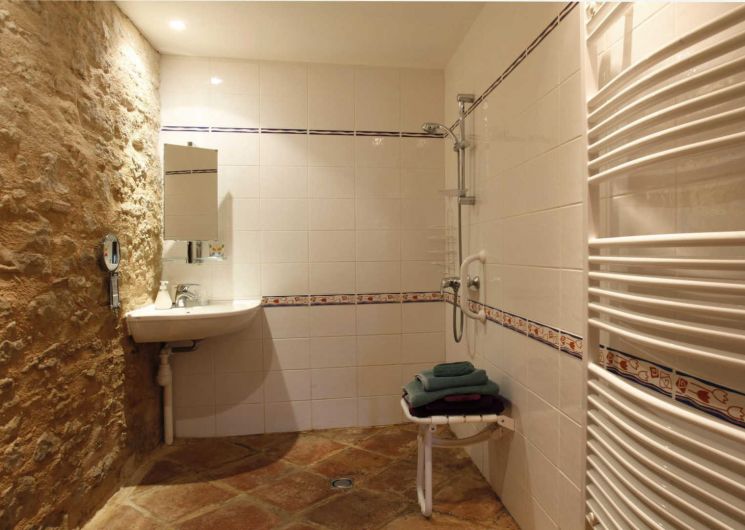 – Chambre avec lit double en 160x200cm, accessible aux personnes à mobilité réduite avec salle d’eau privative avec wc (espace vide sous le lavabo, barre et siège de douche).