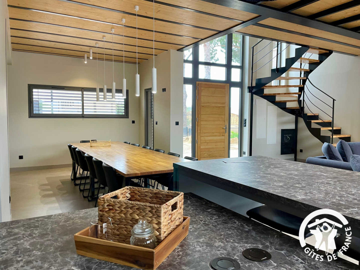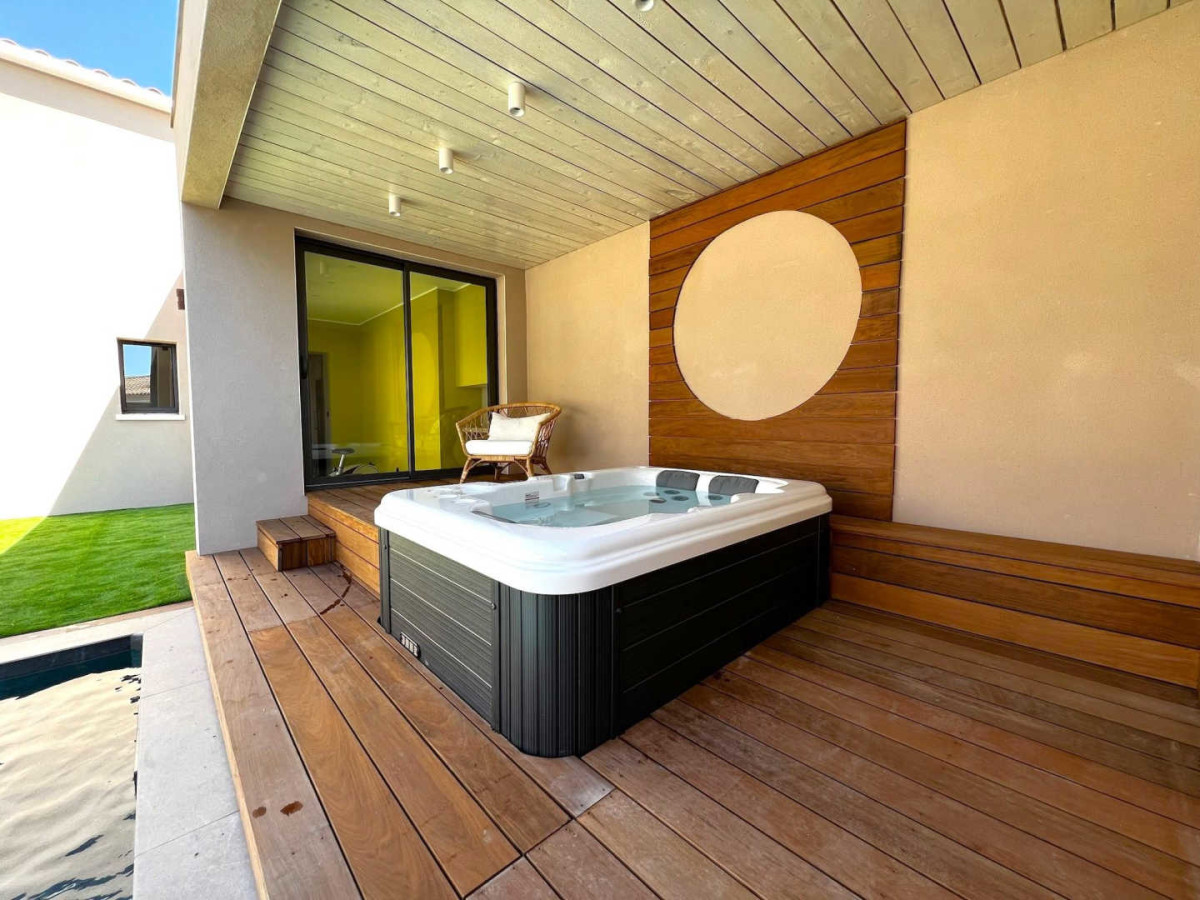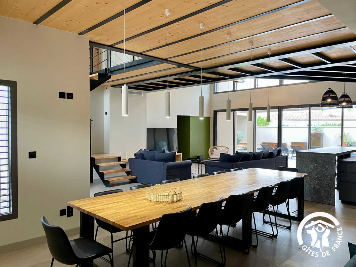 La vaste pièce de vie comprend un salon confortable, une table à manger spacieuse de 14 assises et un coin télévision idéal pour les enfants. Côté cuisine, vous profiterez d’un large plan de travail et de tous les équipements nécessaires (four, réfrigérateur américain, cave à vin, machine à café, robot multifonctions). Les 6 chambres sont dotées de lits king size (180×200), modulables (pour 3) en lits simples. Chaque chambre bénéficie de sa propre salle de bain attenante pour un confort et une intimité optimum. À noter que deux des chambres sont situées dans une dépendance à l’étage, celle-ci dispose de son propre salon, cuisine et terrasse privée. À l’étage toujours, un espace détente comprend un baby-foot et un coin lecture. À l’extérieur, deux espaces distincts vous attendent : à l’avant, un espace clos sous les pins équipé de jeux pour les enfants; à l’arrière, les grandes baies vitrées du salon s’ouvrent sur une terrasse en bois couverte avec une table extérieure et une cuisine d’été équipée d’une plancha et d’un réfrigérateur. Vous pourrez également profiter d’un confortable salon de jardin disposé au bord d’une grande piscine (chauffée selon saison) et d’un spa. Un espace dédié, équipé d’équipements sportifs cardio, est également à disposition. Le stationnement privé est sécurisé par un portail dans la cour de la villa. INCLUS : ménage de fin de séjour, draps, linges de toilette, serviettes de bain, Produits d’accueil d’hygiène. Les petits chiens sont acceptés. ATTRAITS TOURISTIQUES : Découvrez Magalas, au cœur de l’Hérault, reconnu pour ses vignobles, et partez à la découverte d’un domaine local comme celui du “Moulin de Lène”ou domaine “Lafon” . À quelques kilomètres seulement, prenez le temps de découvrir la riche histoire de Béziers puis profitez du littoral héraultais en vous prélassant sur les plages du Cap d’Agde, avant d’arpenter le Mont Saint-Clair à Sète, depuis lequel vous profiterez d’un panorama impressionnant sur l’étang de Thau.