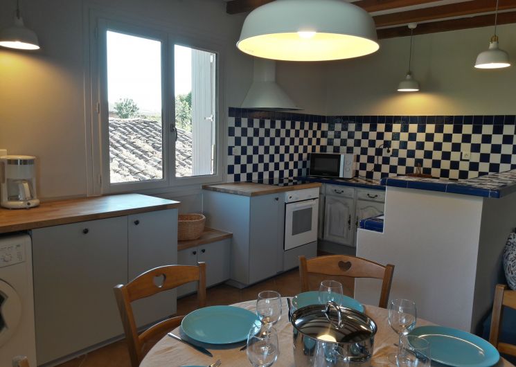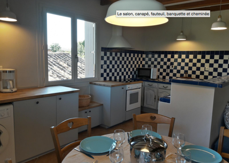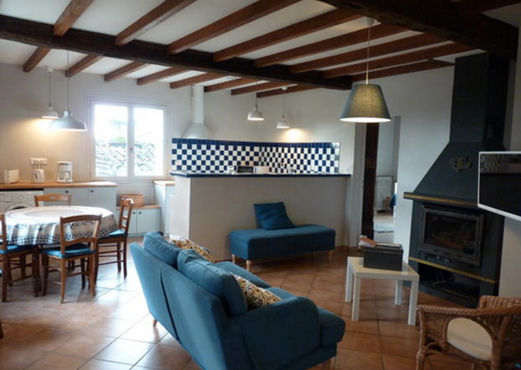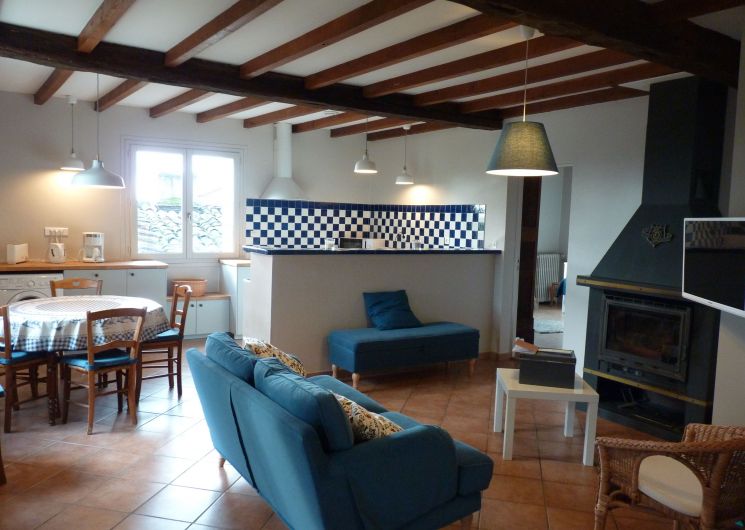 Die Küche ist offen für das Wohnzimmer in einem großen Raum mit Kamin (Geschirrspüler, Waschmaschine, Mikrowelle, Brotnetz, Wasserkocher, Ofen, Induktionskochfeld, Kapuze, Kühlschrankfrierer).