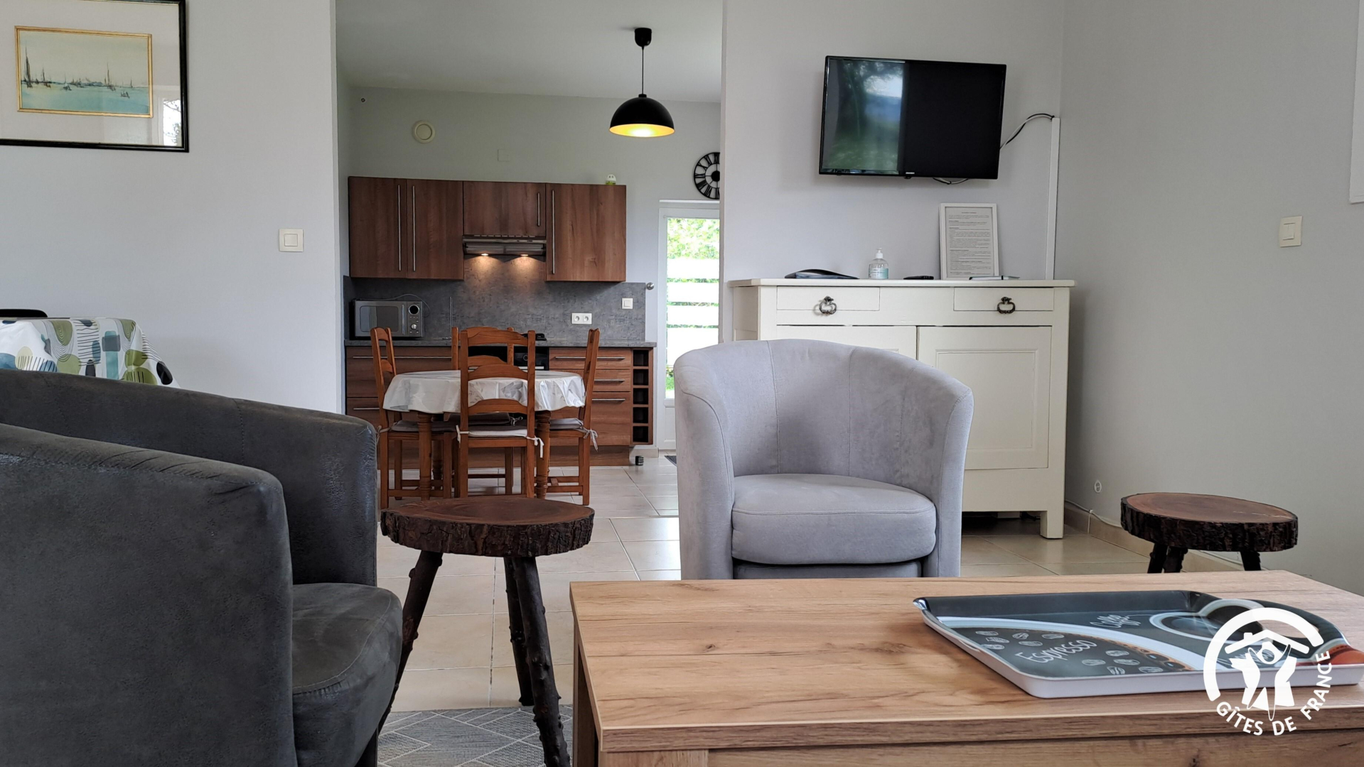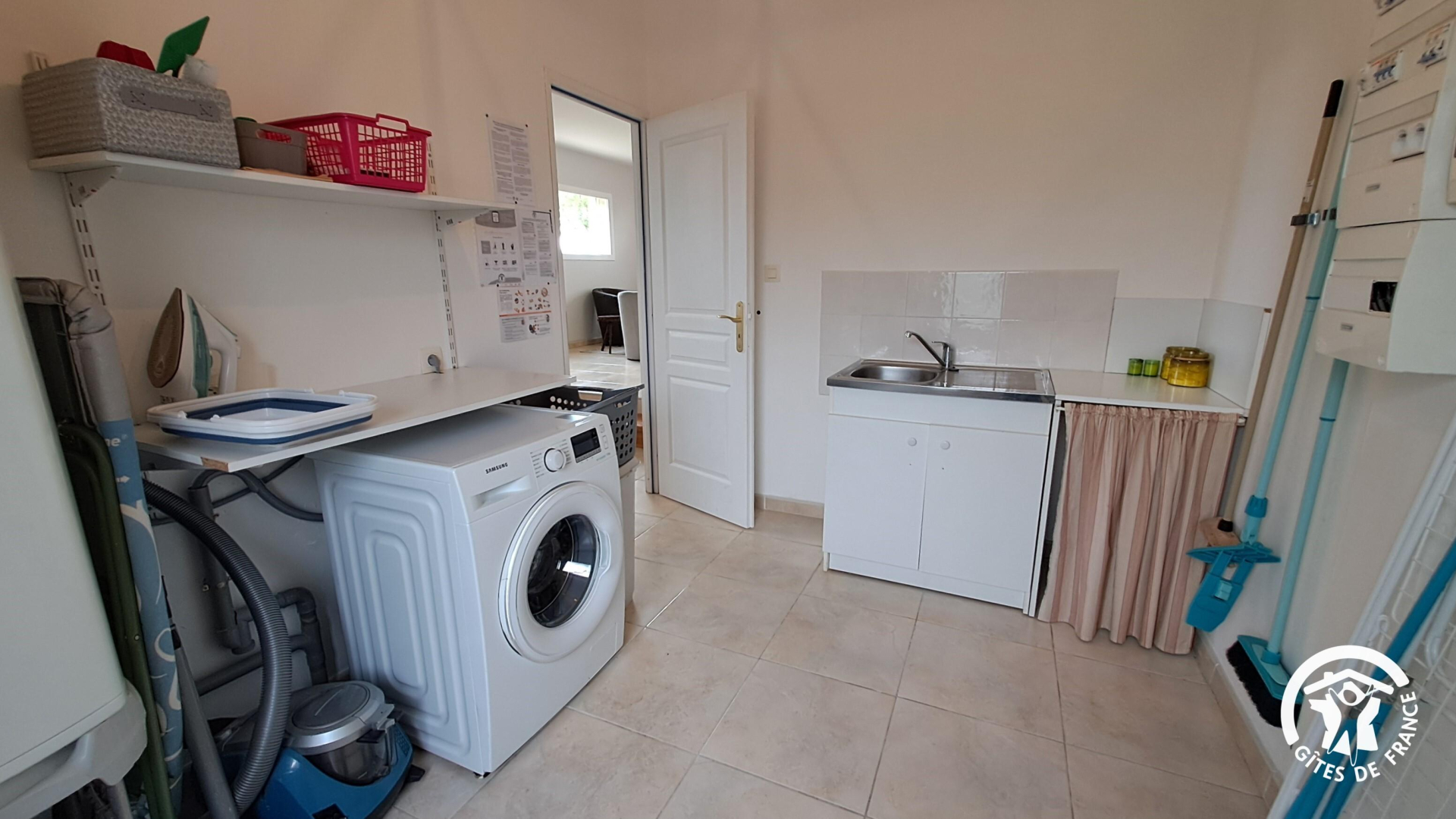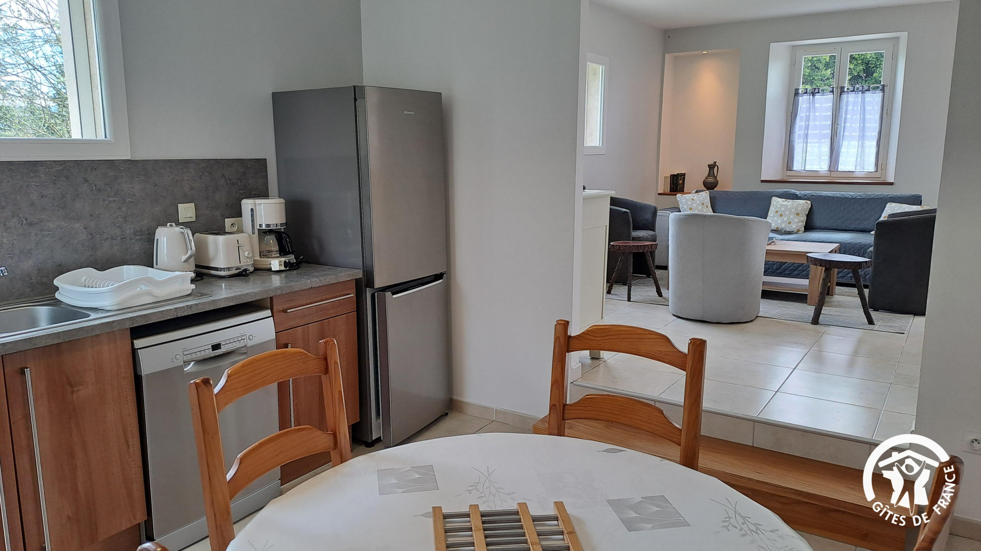 Rez-de-chaussée : pièce à vivre avec cuisine ouverte toute équipée, coin salon, cellier avec lave-linge, wc.