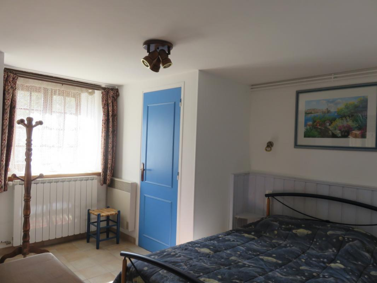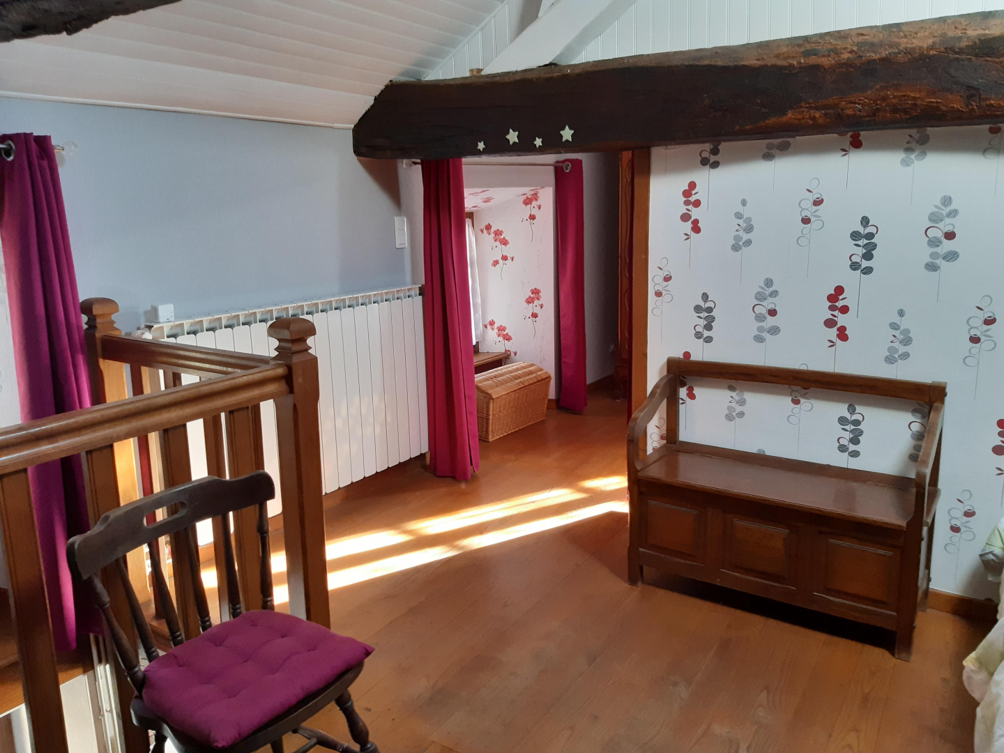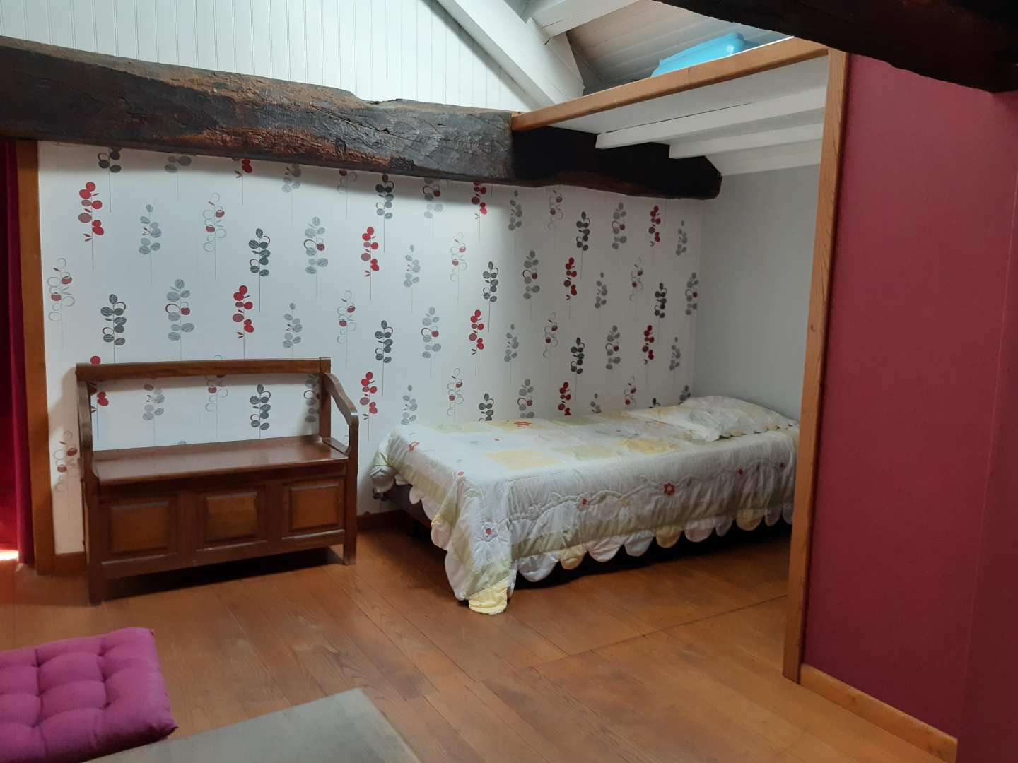 A l’étage : pièce à vivre avec cuisine ouverte, coin salon, insert (bois fourni). En rez-de-jardin : une chambre (un lit double en 140×190), salle d’eau et wc privatifs. Au premier étage : chambre (lit double en 140×190), + un coin couchage pour un enfant (lit simple 90×190), salle de bains (baignoire), wc.
