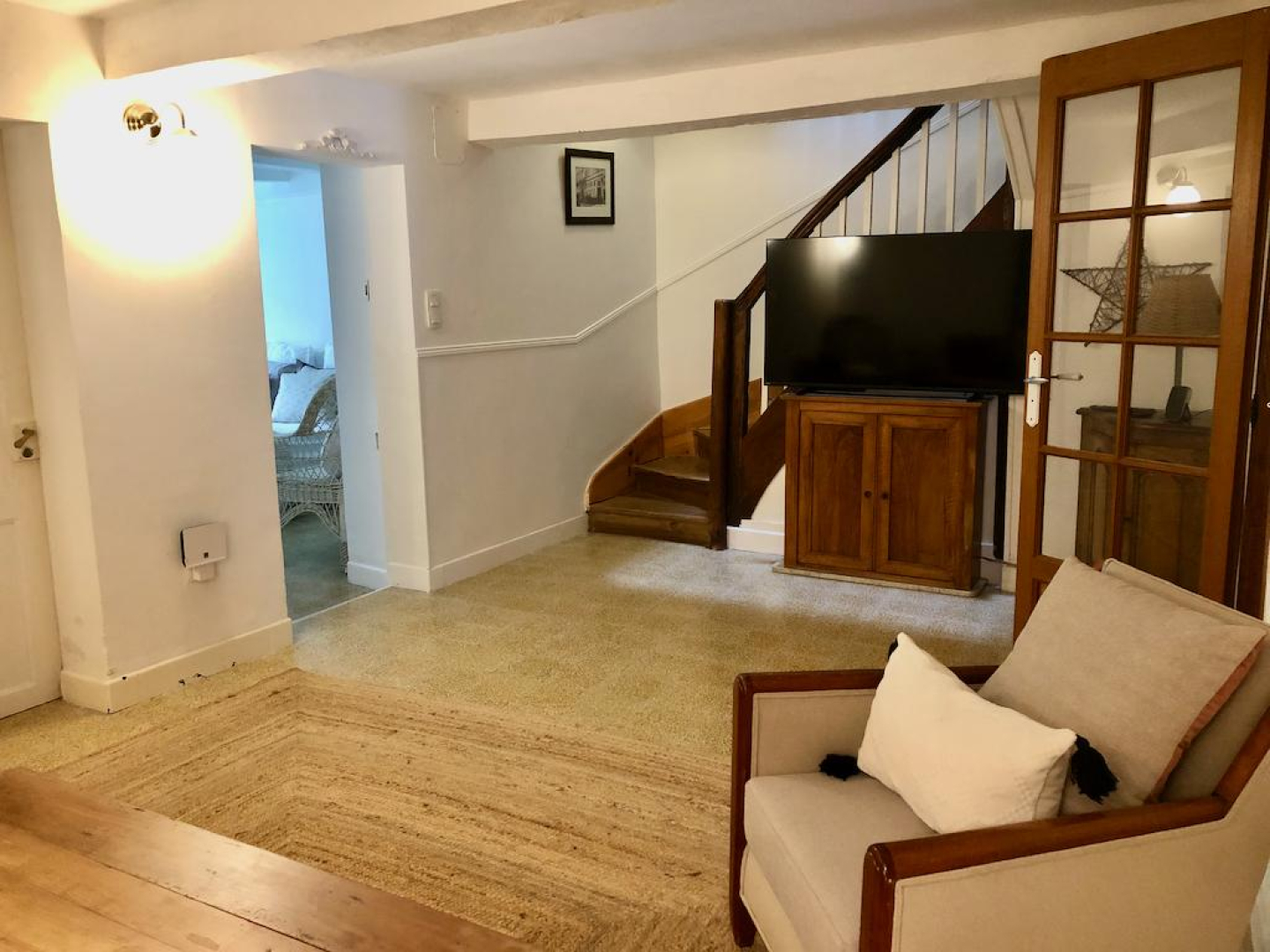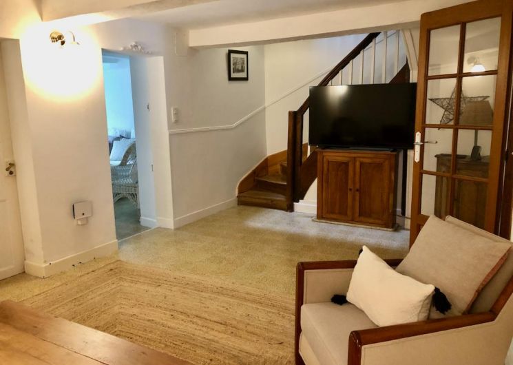 Par quelques marches on accède au salon avec canapé, fauteuils, TV.