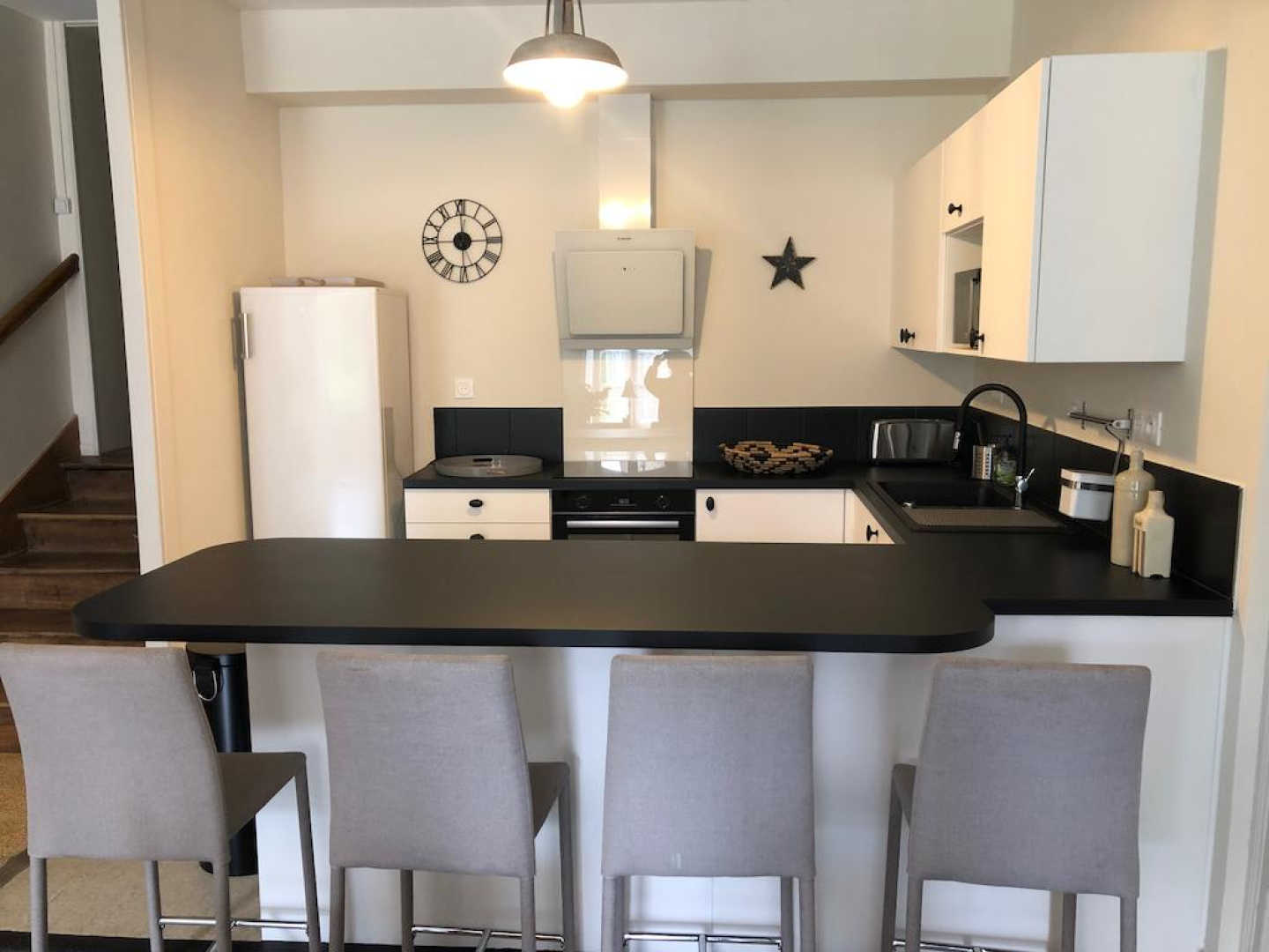 On entre dans le gîte directement dans la grande salle à manger avec cuisine ouverte toute équipée (réfrigérateur, four, lave-vaisselle, micro-ondes, cafetière filtre + Nespresso, barbecue électrique), comptoir et chaise hautes, grande table (jusqu’à 14 couverts), vaisselier.