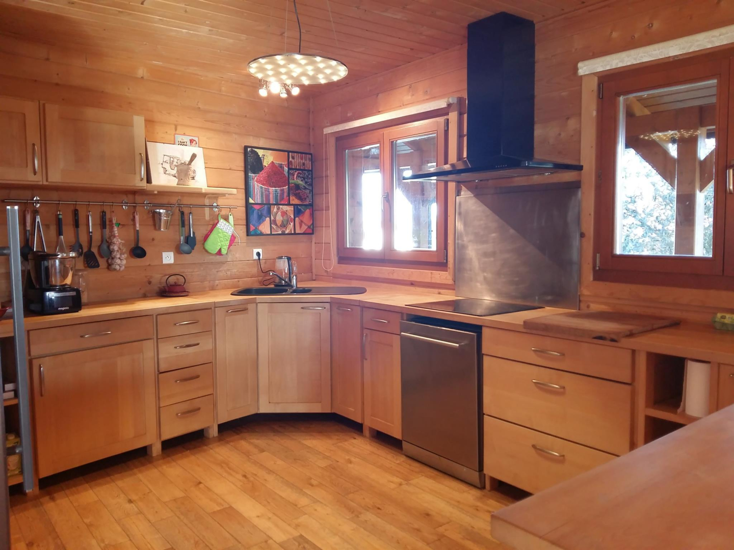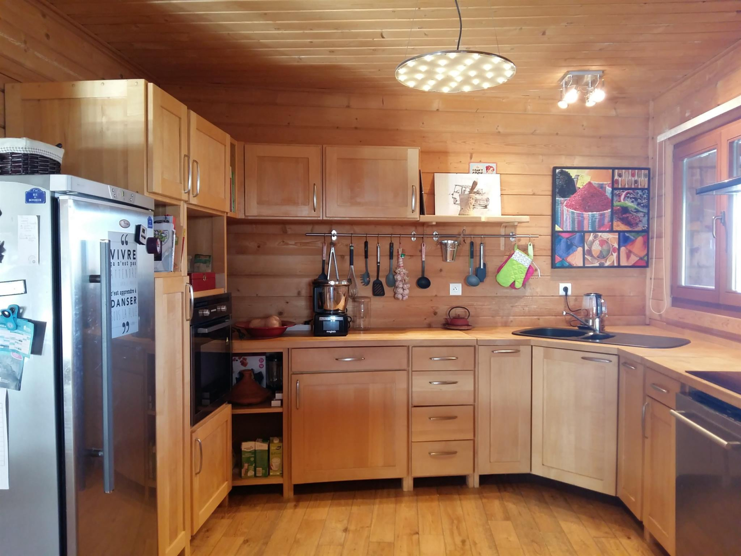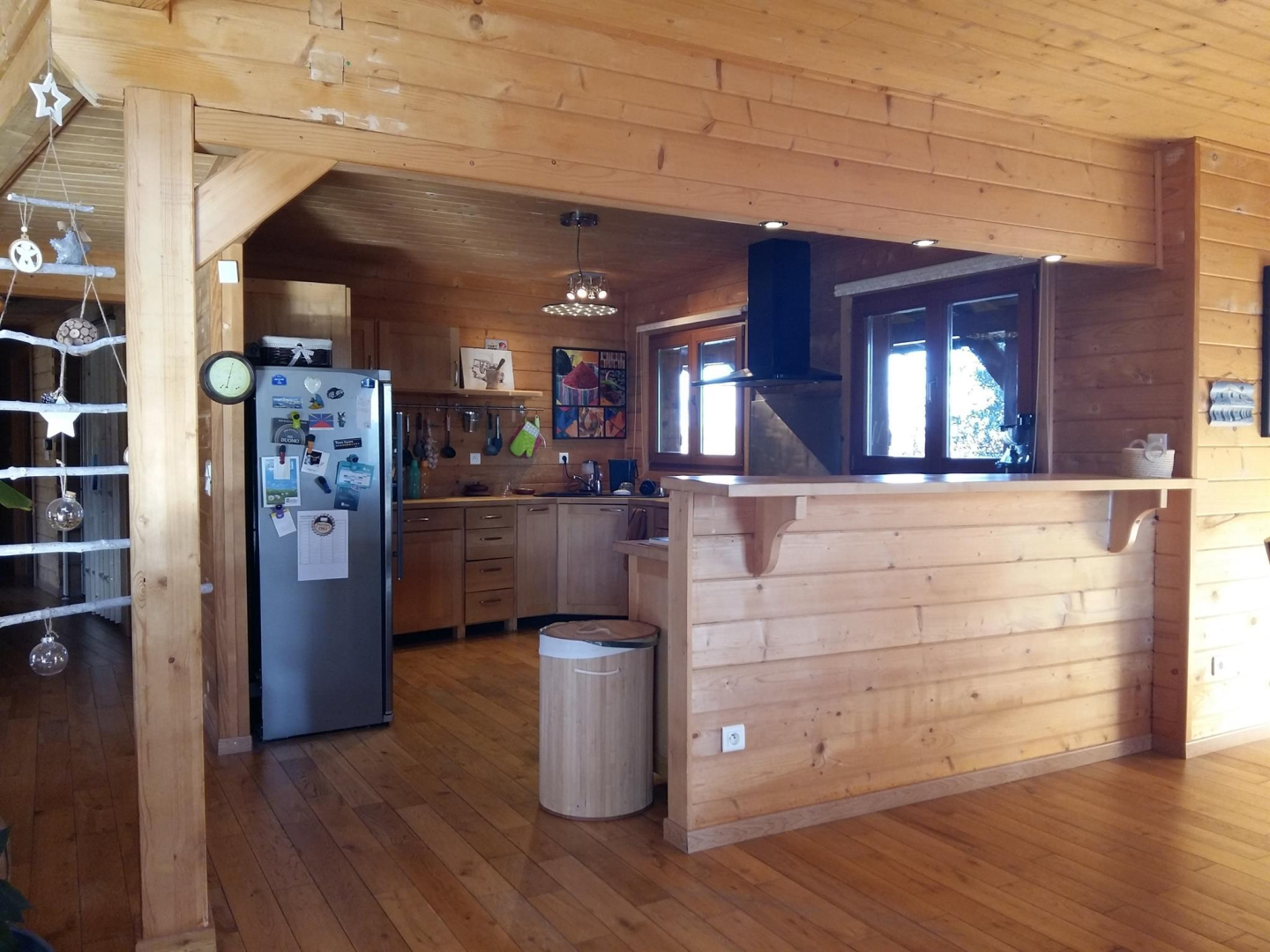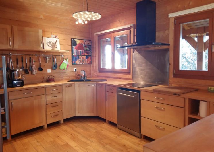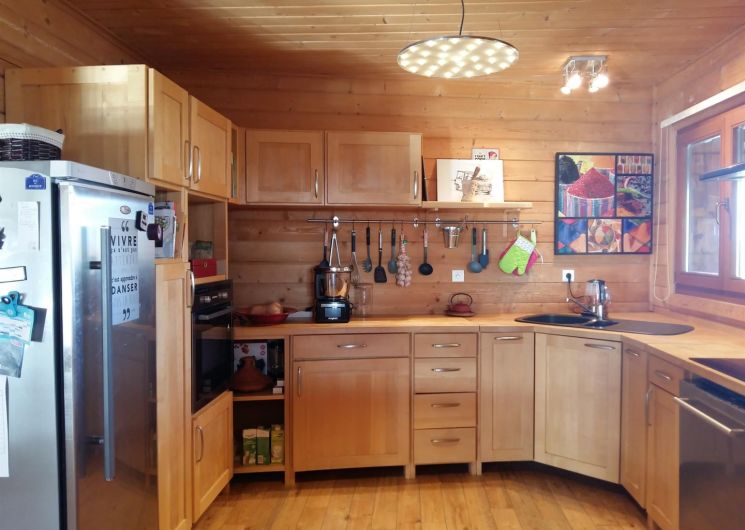 – cuisine ouverte toute équipée (réfrigérateur, plaque, four, lave-vaisselle, etc…)