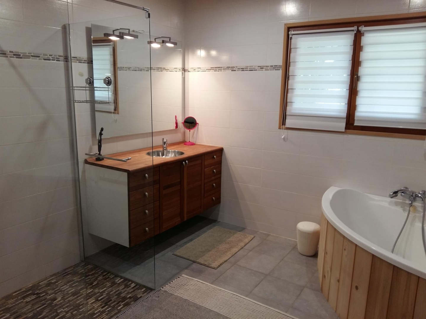 – salle de bain (baignoire d’angle + douche), wc.