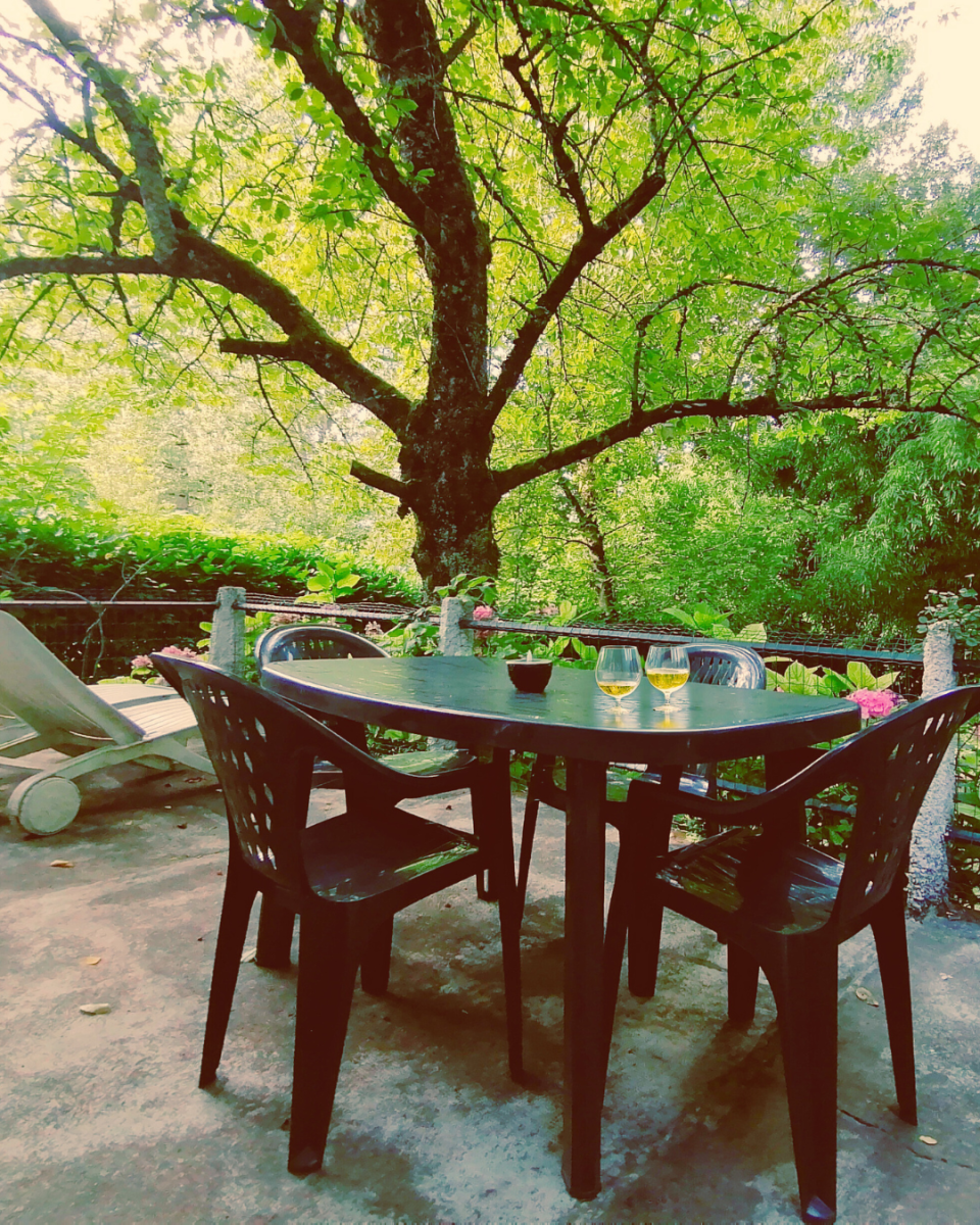Une grande terrasse ombragée, équipée d’un barbecue et installée sous un majestueux cerisier, vous promet de beaux moments de convivialité en pleine nature.