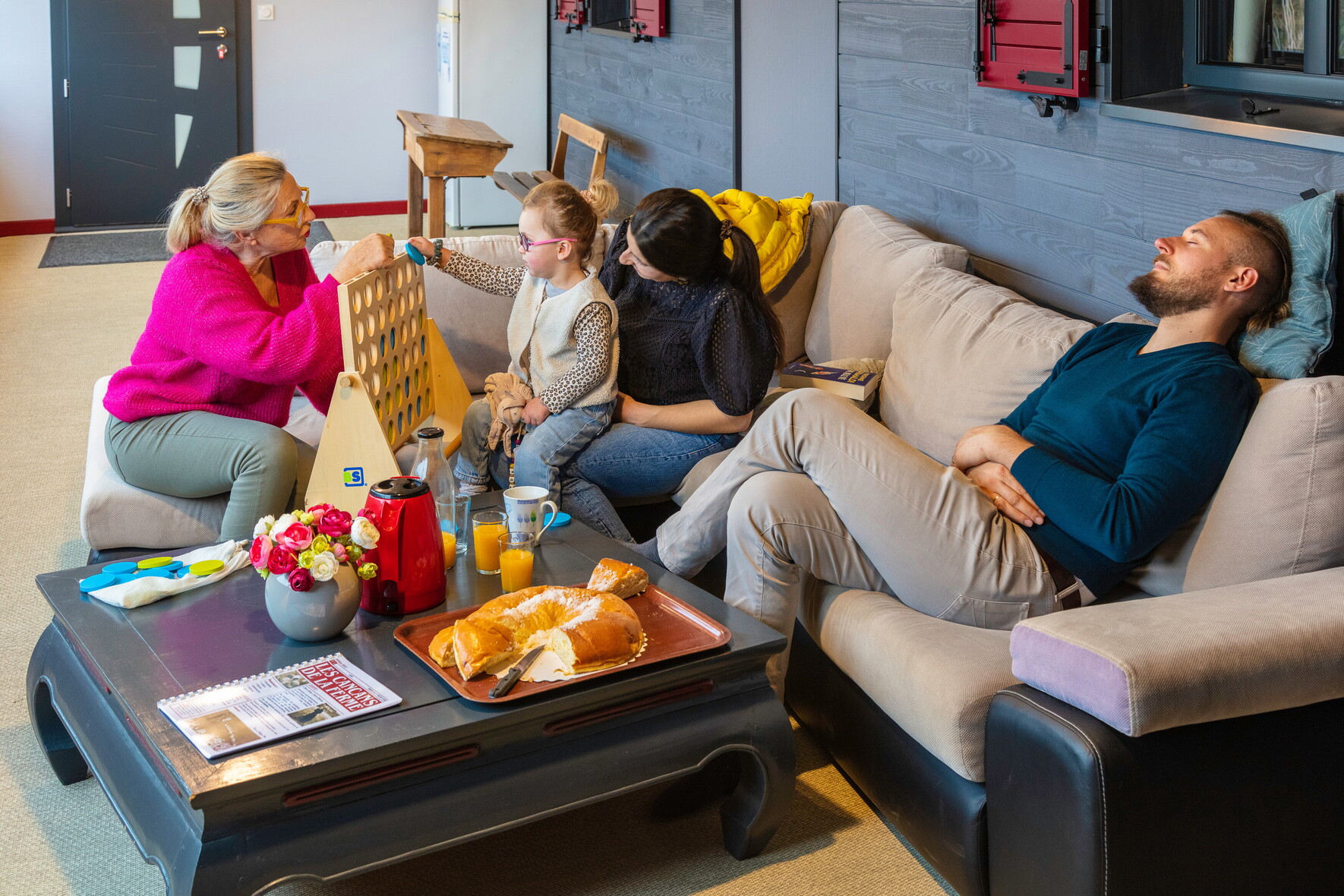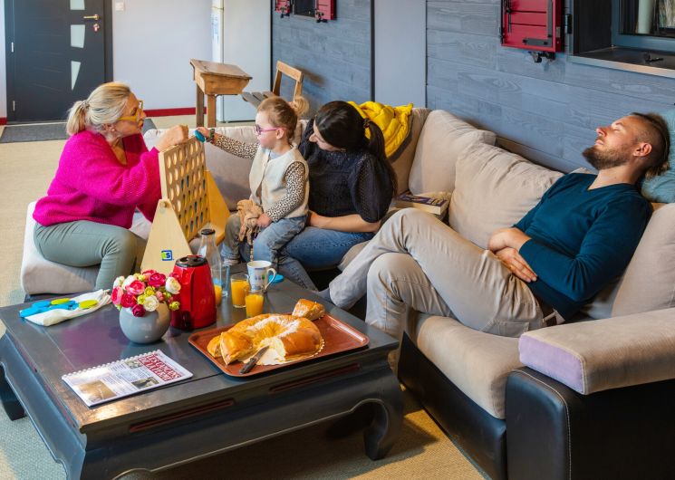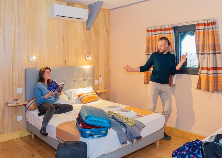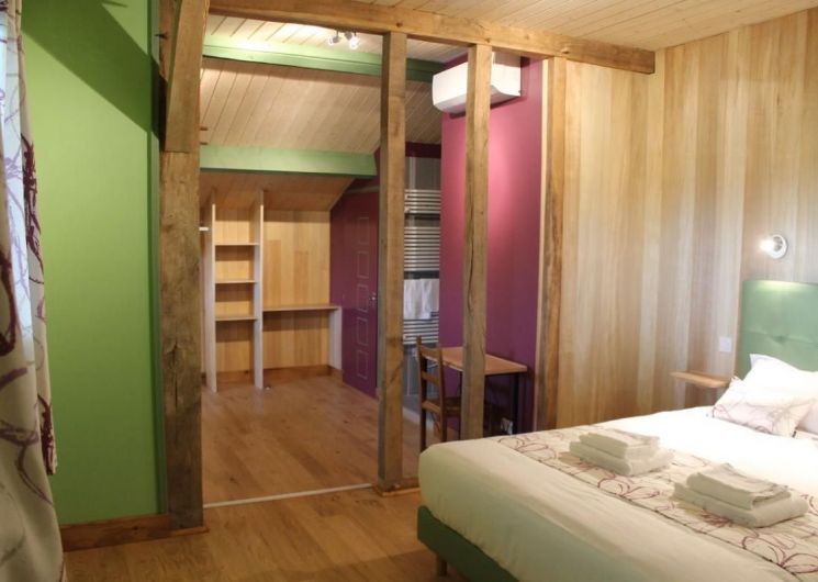 Toutes les chambres sont climatisées et disposent d’une salle d’eau et de toilettes privatives. 4 chambres à l’étage : Chambre Pêche Triple avec 1 lit 90 et 1 lit 160, fenêtre donnant sur coursive/salon. Ce salon baigné de lumière grâce à sa grande baie vitrée offre aux vacanciers des 5 chambres, détente (TV, livres…) et vue panoramique. Chambre Mirabelle Triple avec 1 lit 90 et 1 lit 160. Chambre Noisette avec 1 lit 160. Chambre Pomme Familiale avec 2 lits 160 et 1 lit 90. Au rdc : Chambre Prunelle avec 1 lit 160, accessible aux personnes à mobilité réduite.