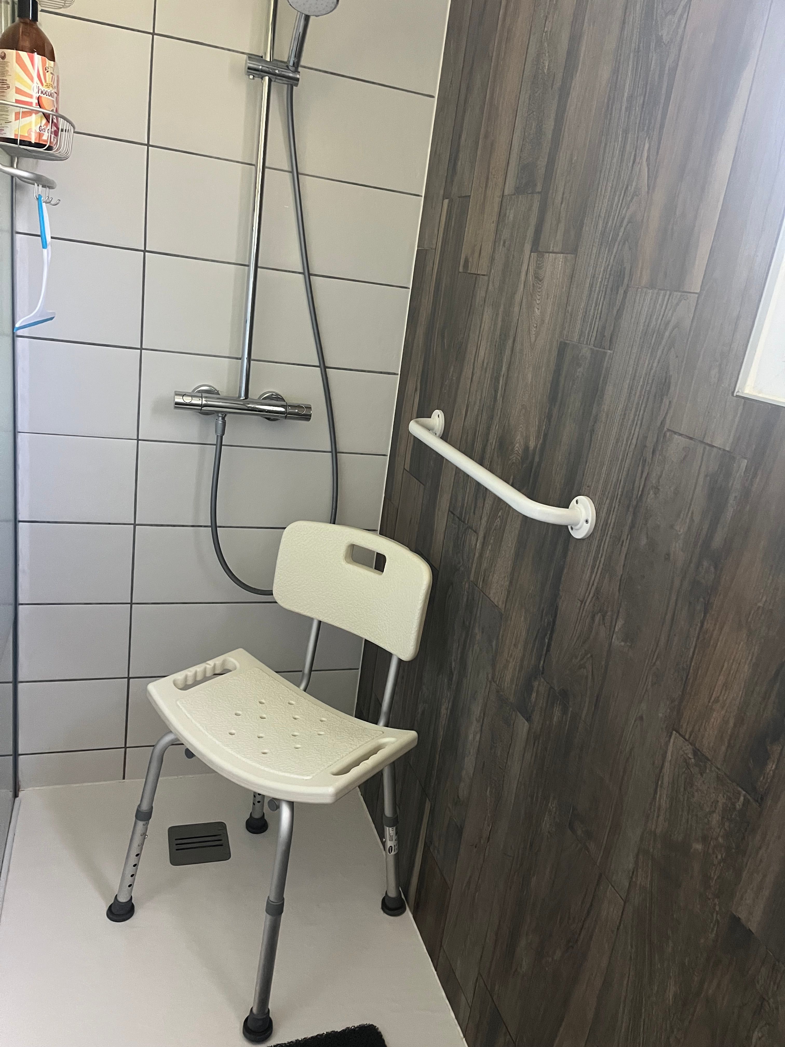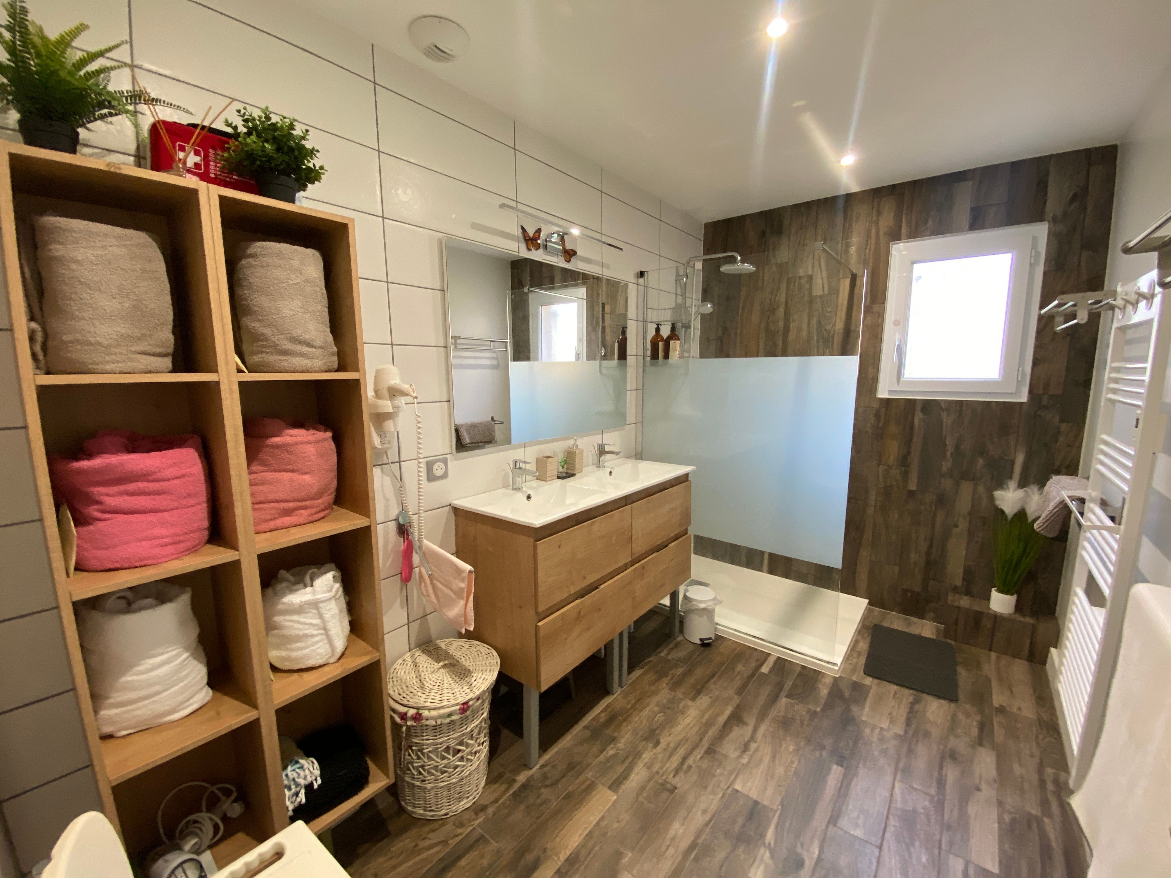 Large shower room with double washbasin and spacious walk-in shower, separate WC.