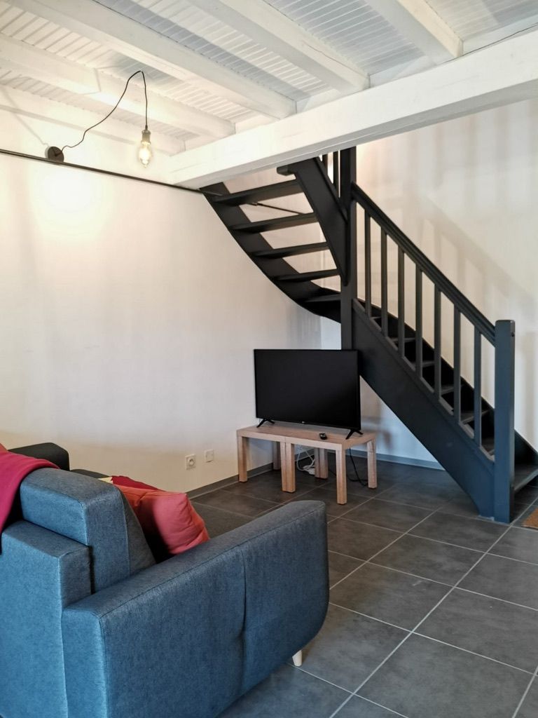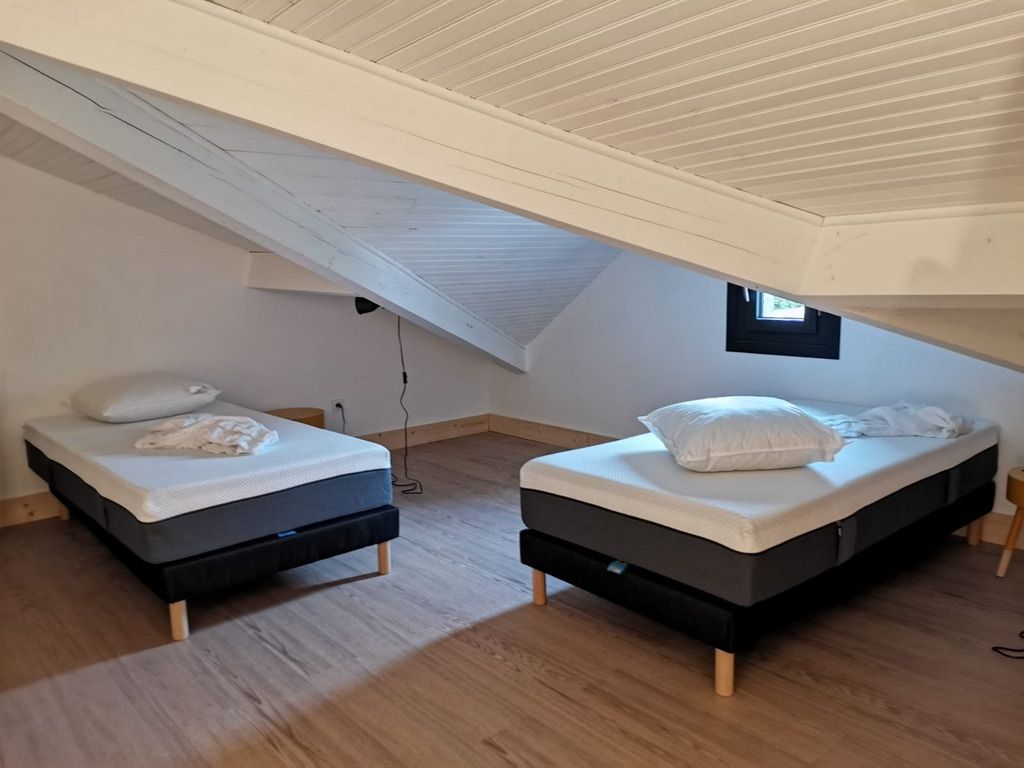 Living room with a kitchen area and a TV area : 1 large sofa and armchair, fitted kitchen (fridge/freezer, microwave, hob, oven), 1 bedroom (1x140cm), 1 bathroom with WC. On the 1st floor an attic bedroom with two x0.90m beds.