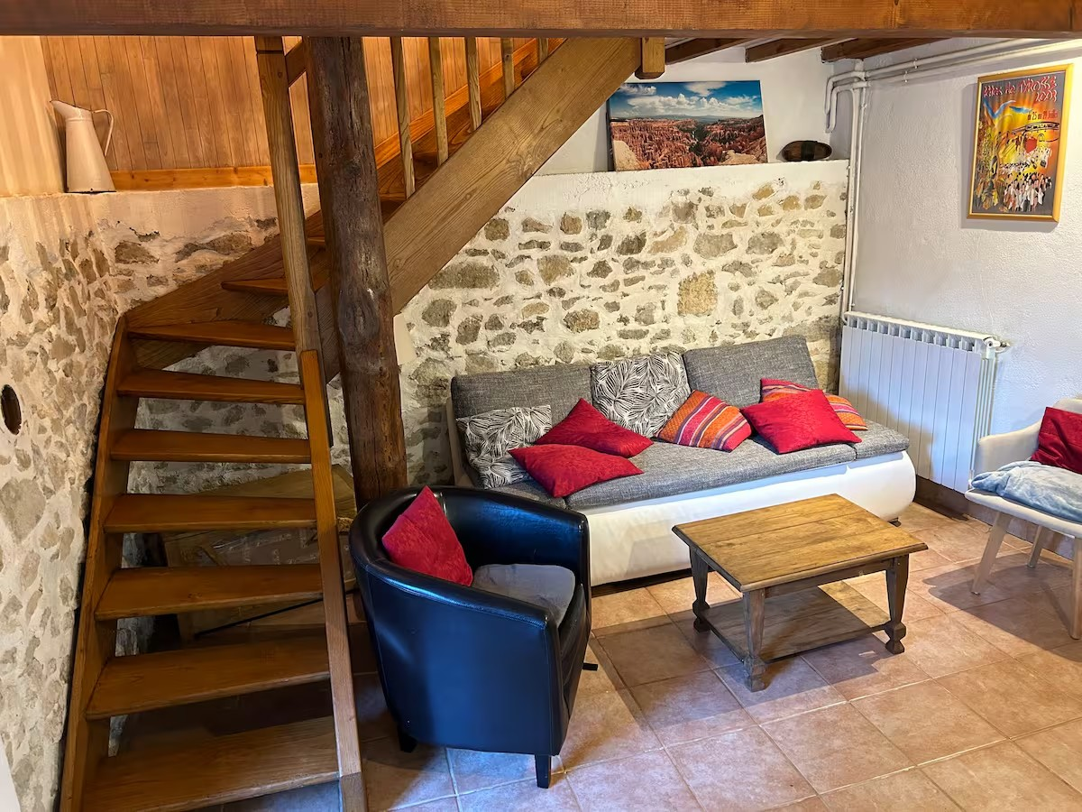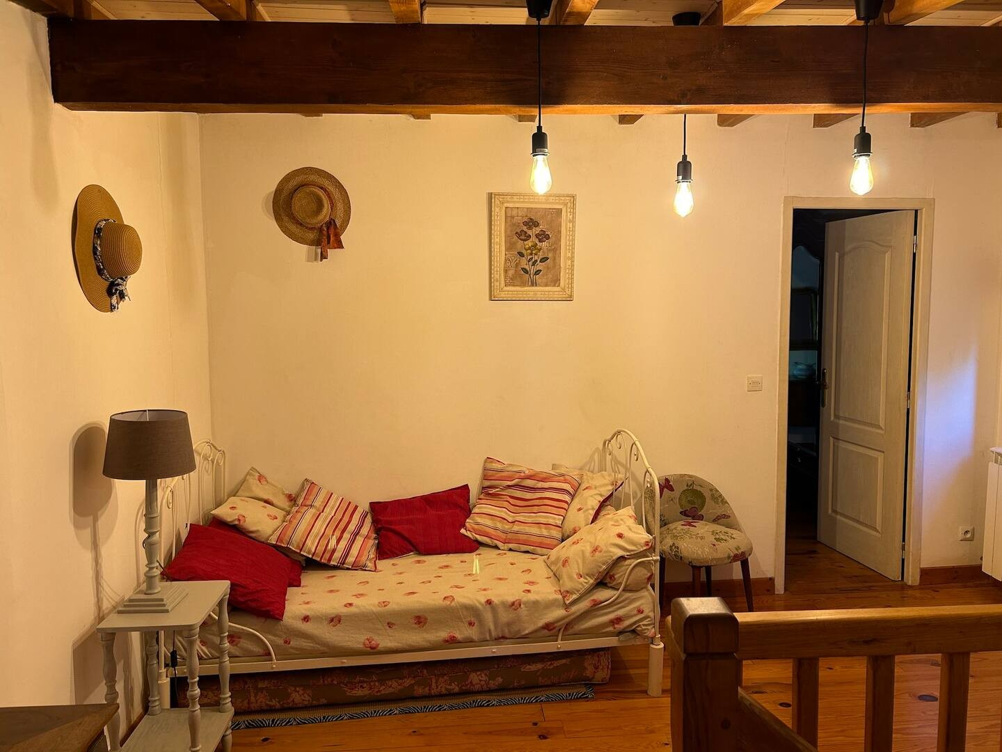 Étage : 1 chambre confortable (lit 2 places), salle de bain et WC, ainsi qu’une mezzanine avec espace détente