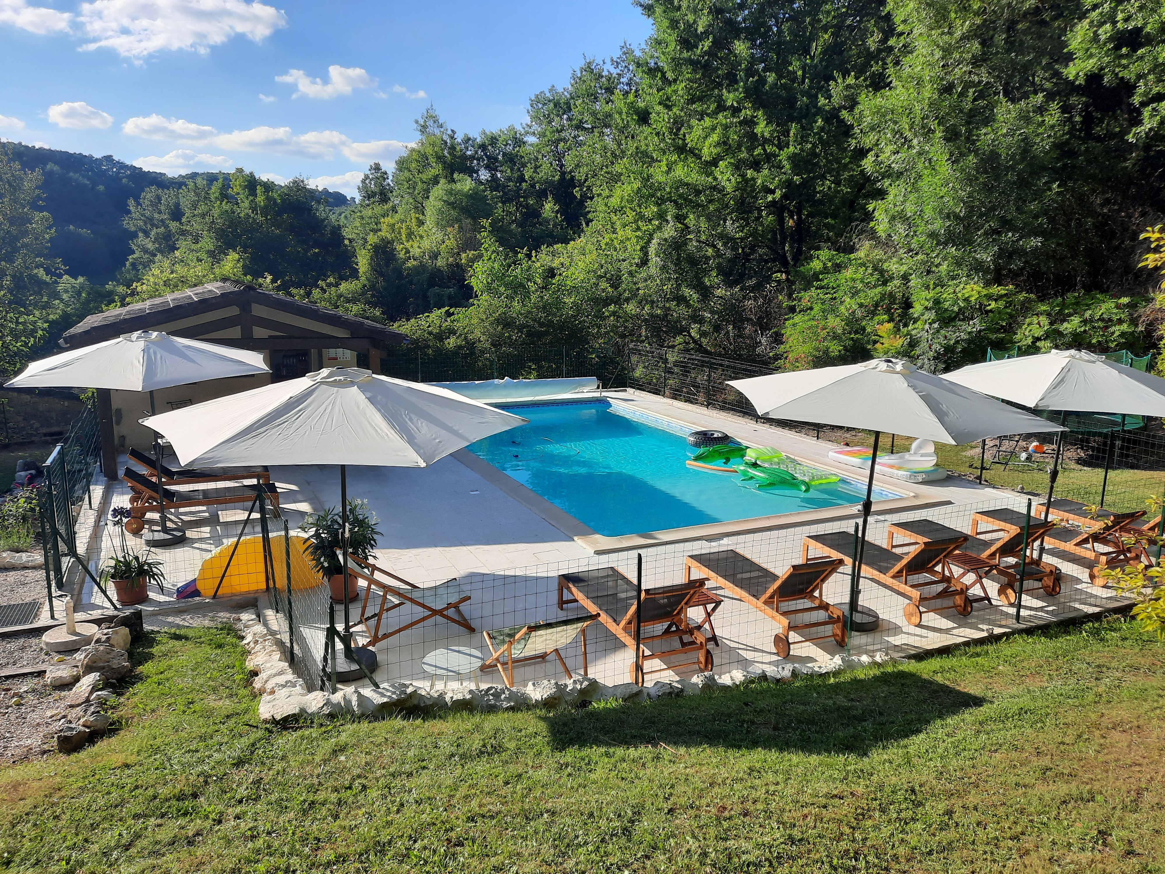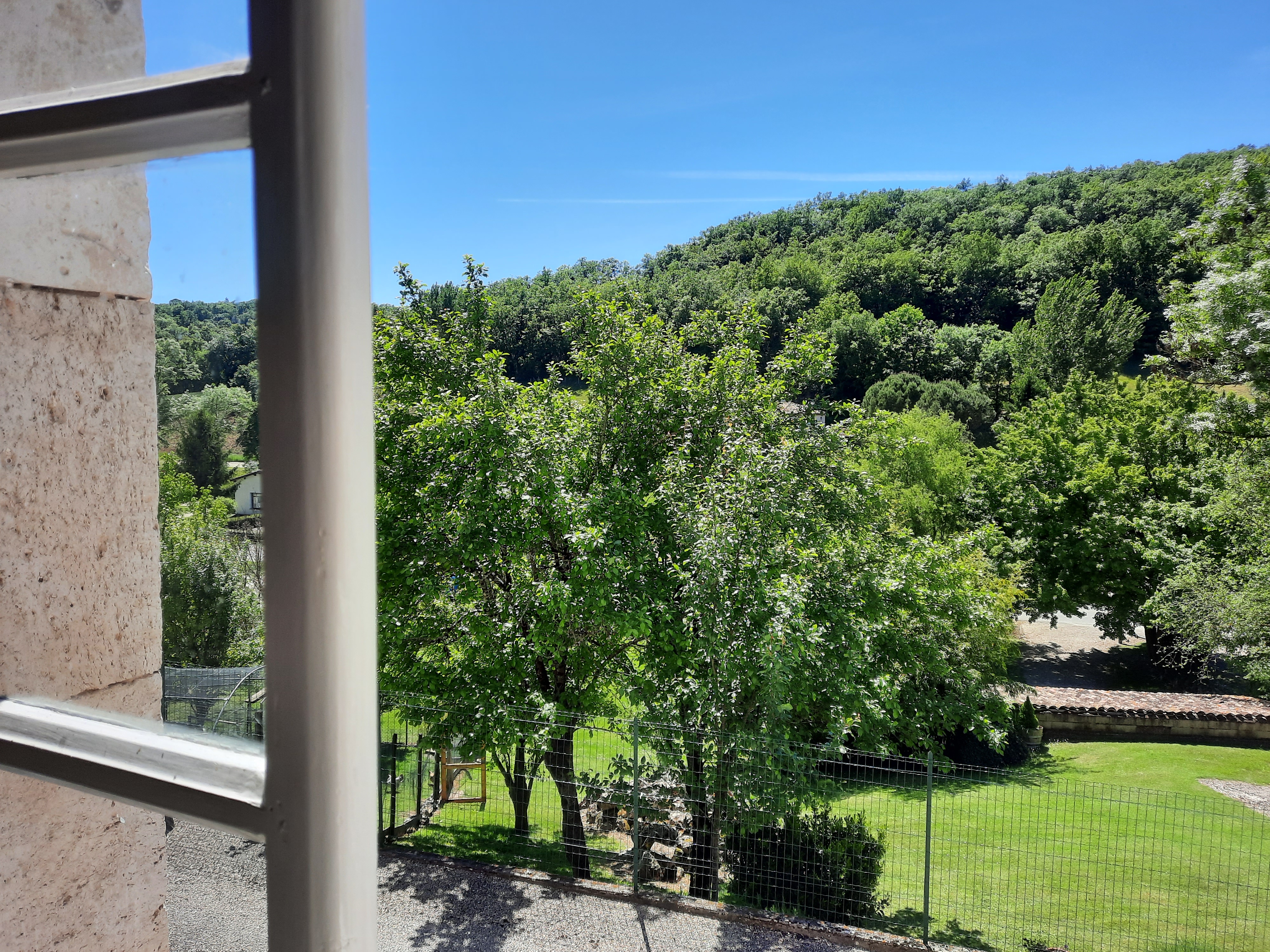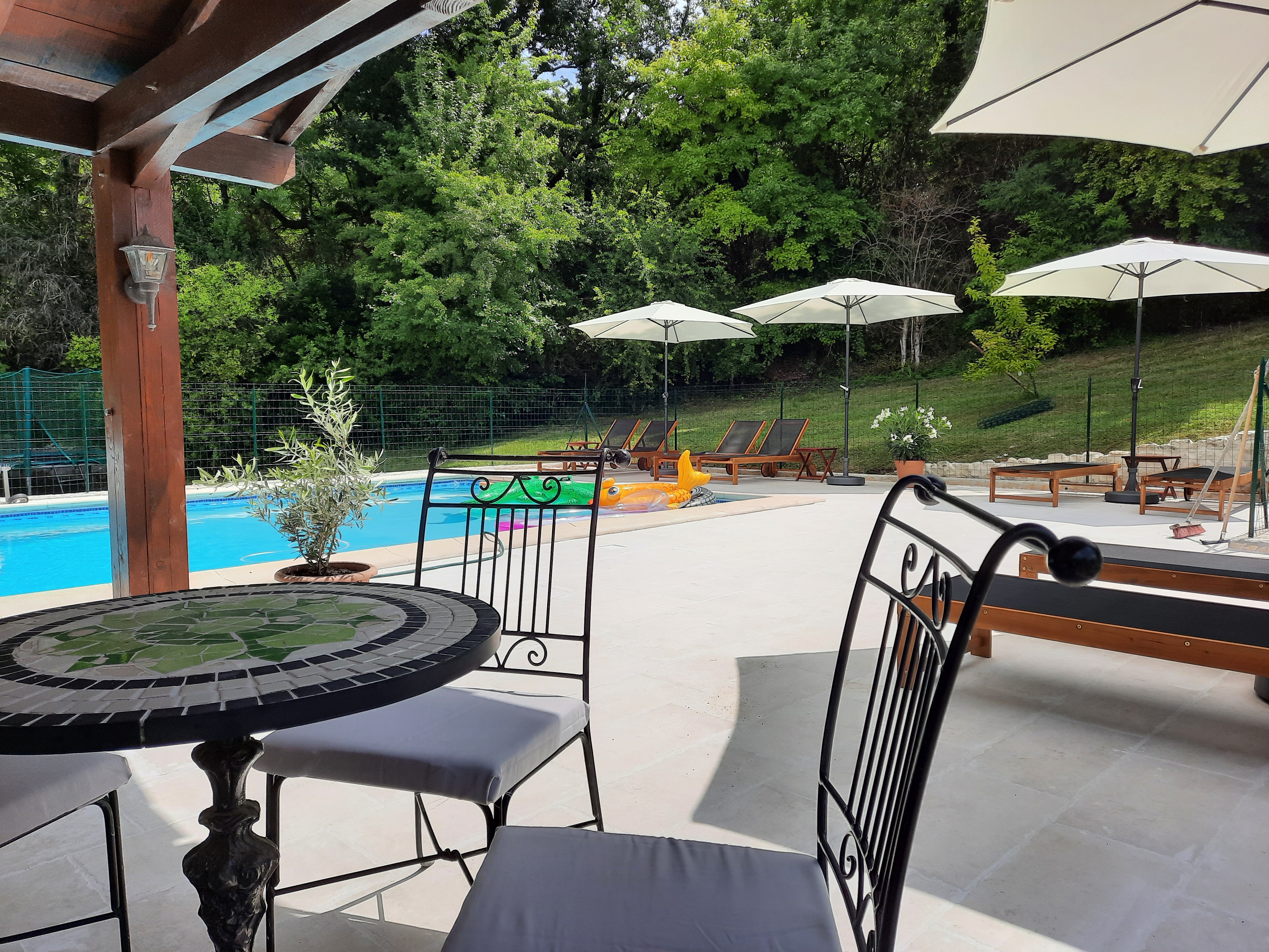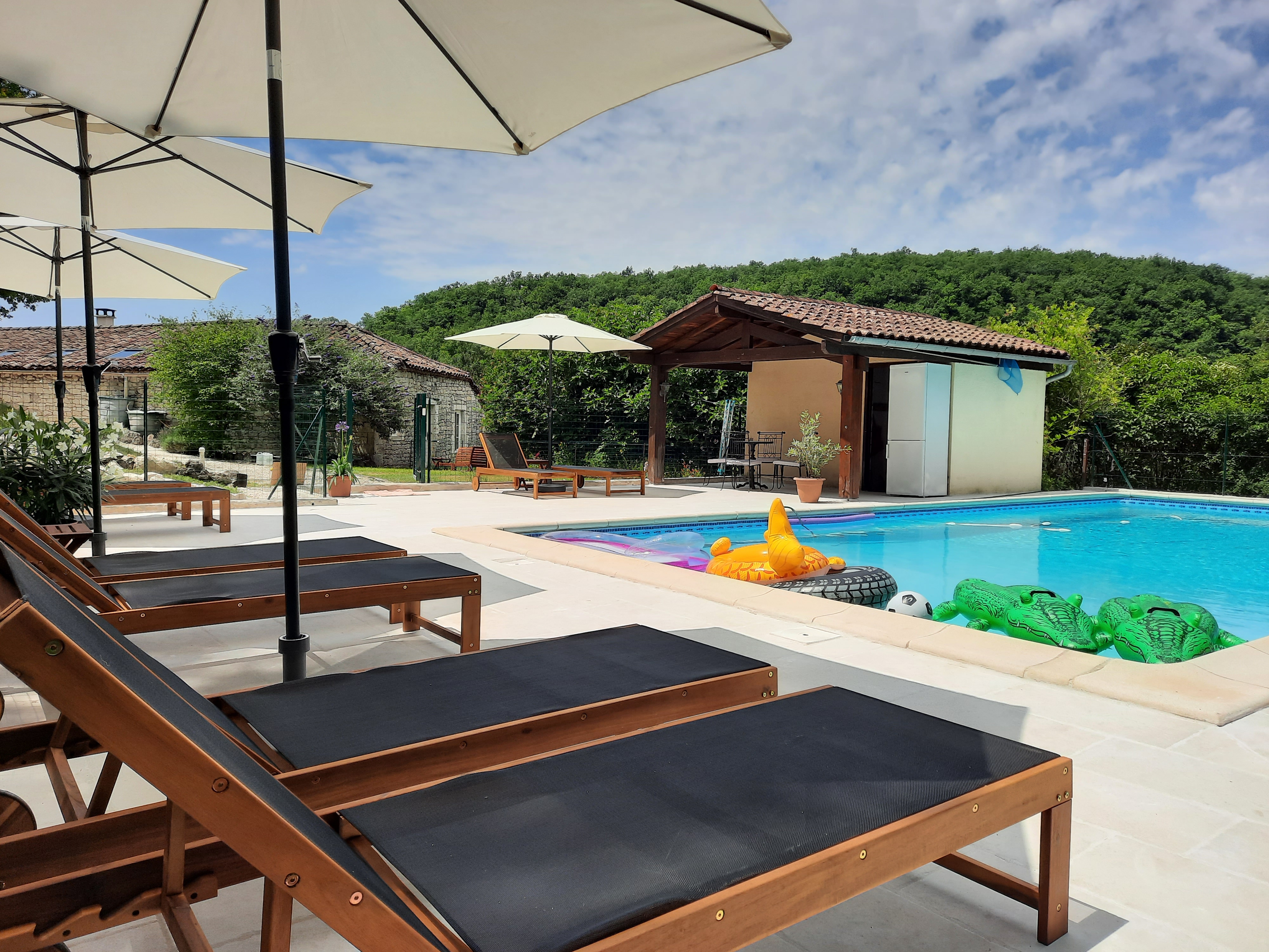 The gîte Le Tournesol is situated on the small estate of Touffailles, between the green hills and sunflower fields in the south of France. The estate consists of 3 holiday houses and the owners’ house. It is particularly suitable for children. There is a beautiful heated swimming pool of 5×10 metres on site and many walking and cycling paths nearby. From the gîte you can walk to the lower village where there is a boulangerie.