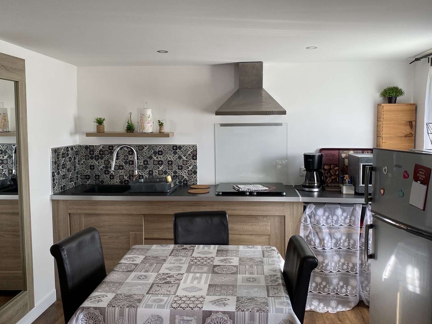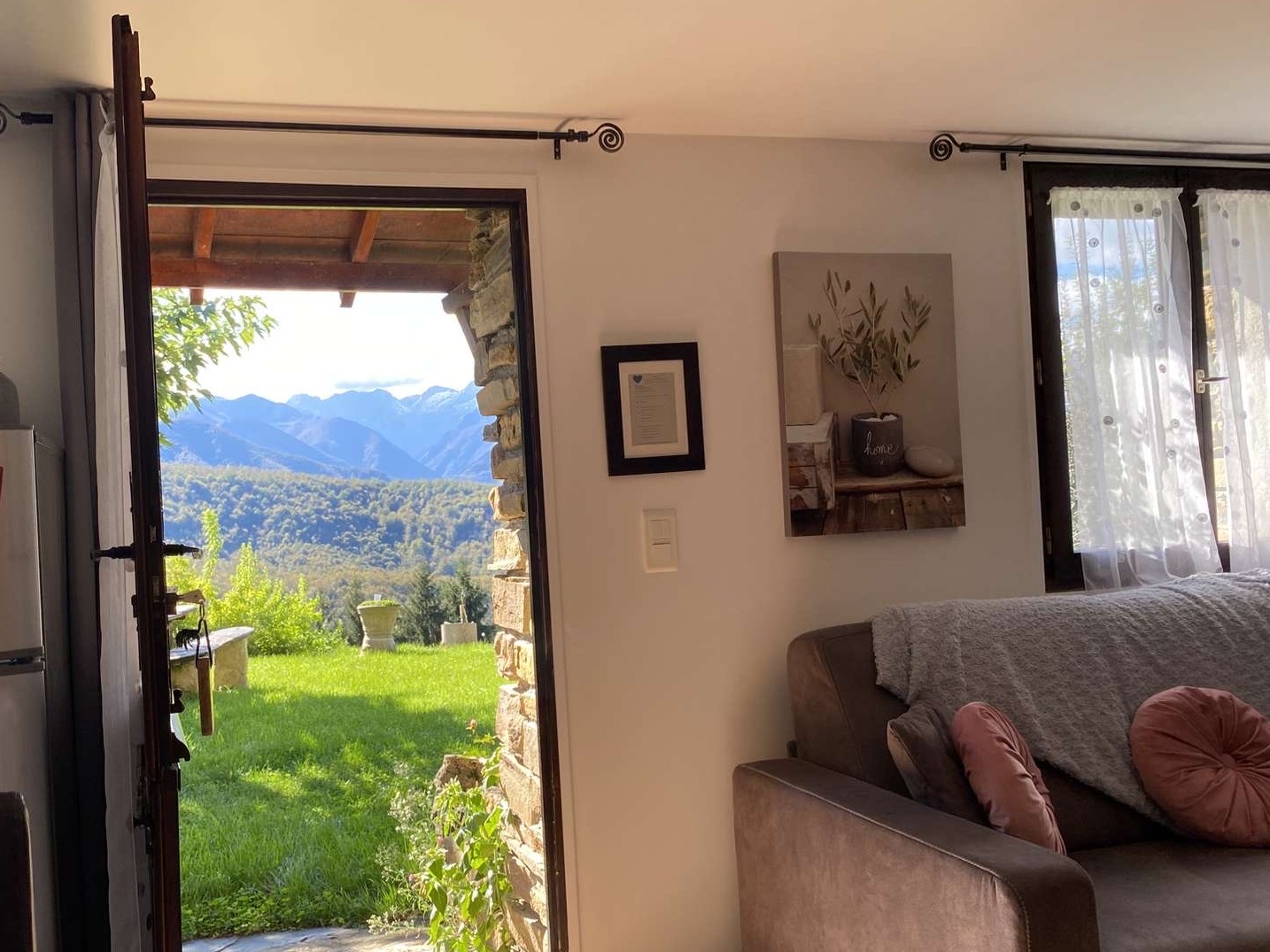Comfortable, self-contained private accommodation on the ground floor of the building. View of Mont Valier. Kitchen open to the living room, with a sofa bed and view of Mont Valier. 2 adults , 1 young child