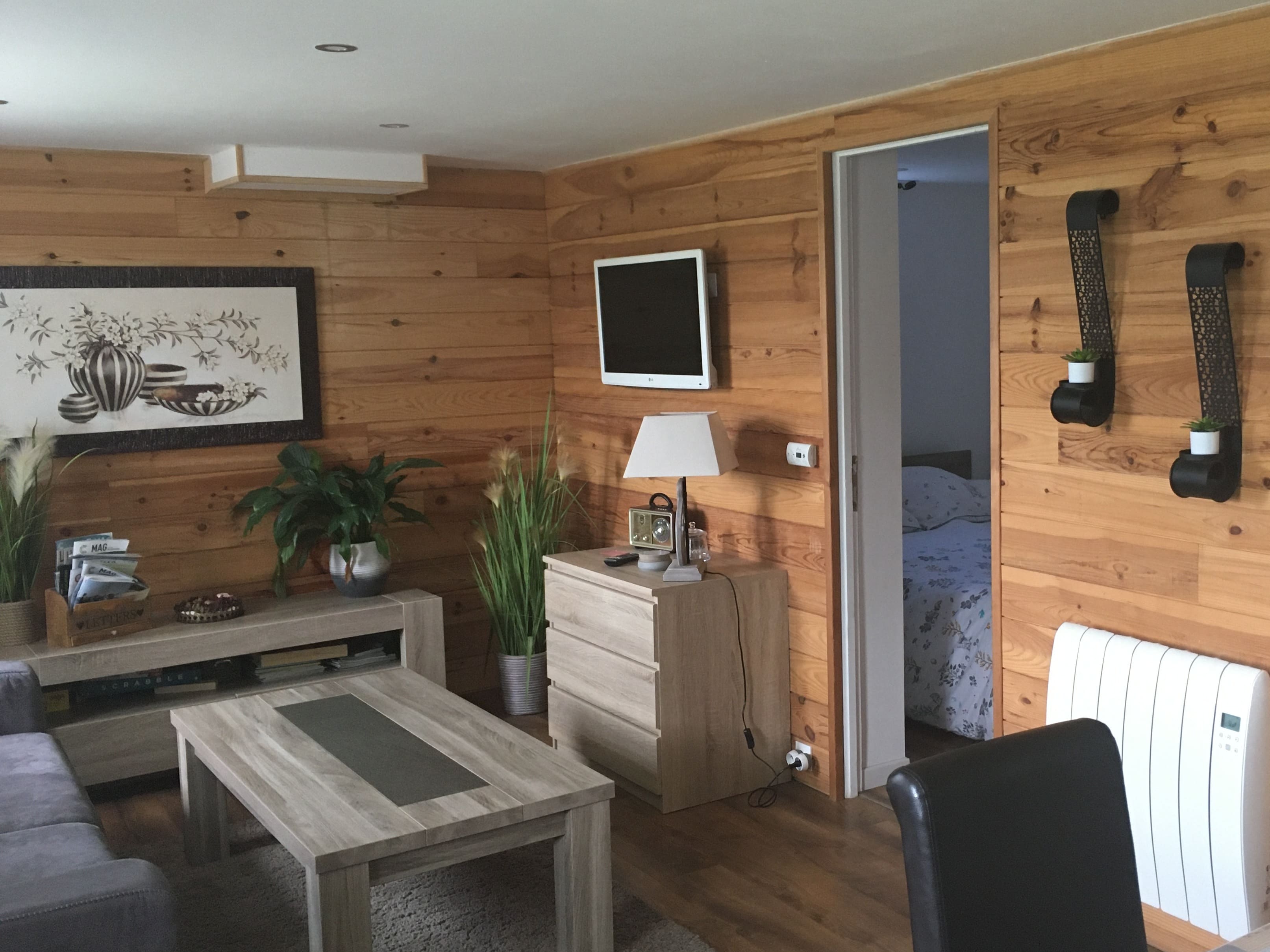Studio on the ground floor of the large cottage, for 2 to 3 people. It consists of a bedroom with a double bed and a sofa bed in the living room for bringing your child along. The kitchen, which opens onto the living room, is equipped for your utmost comfort. Fireplace, television and Wi-Fi.
