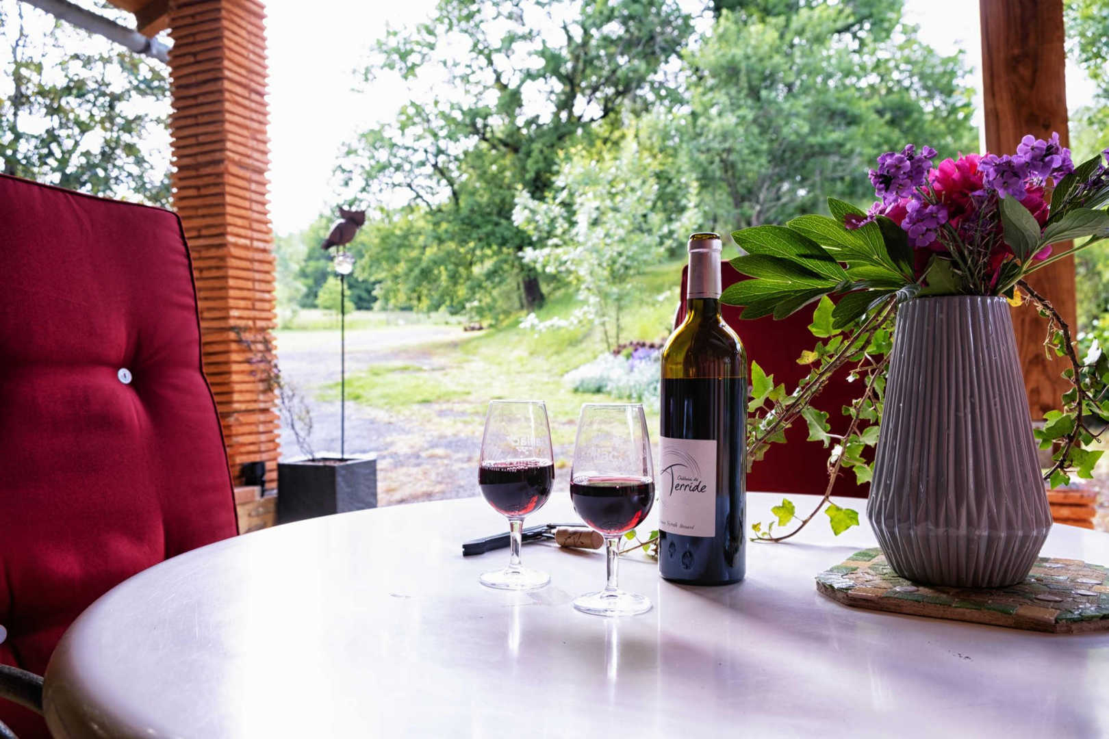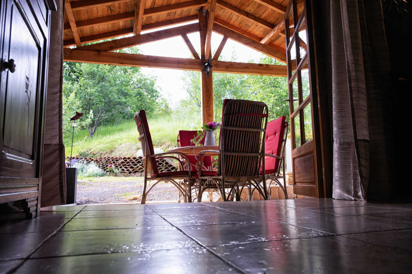 Une terrasse couverte au soleil levant avec vue sur les prés où parfois les animaux viennent se restaurer (chevreuils, lièvres, …).