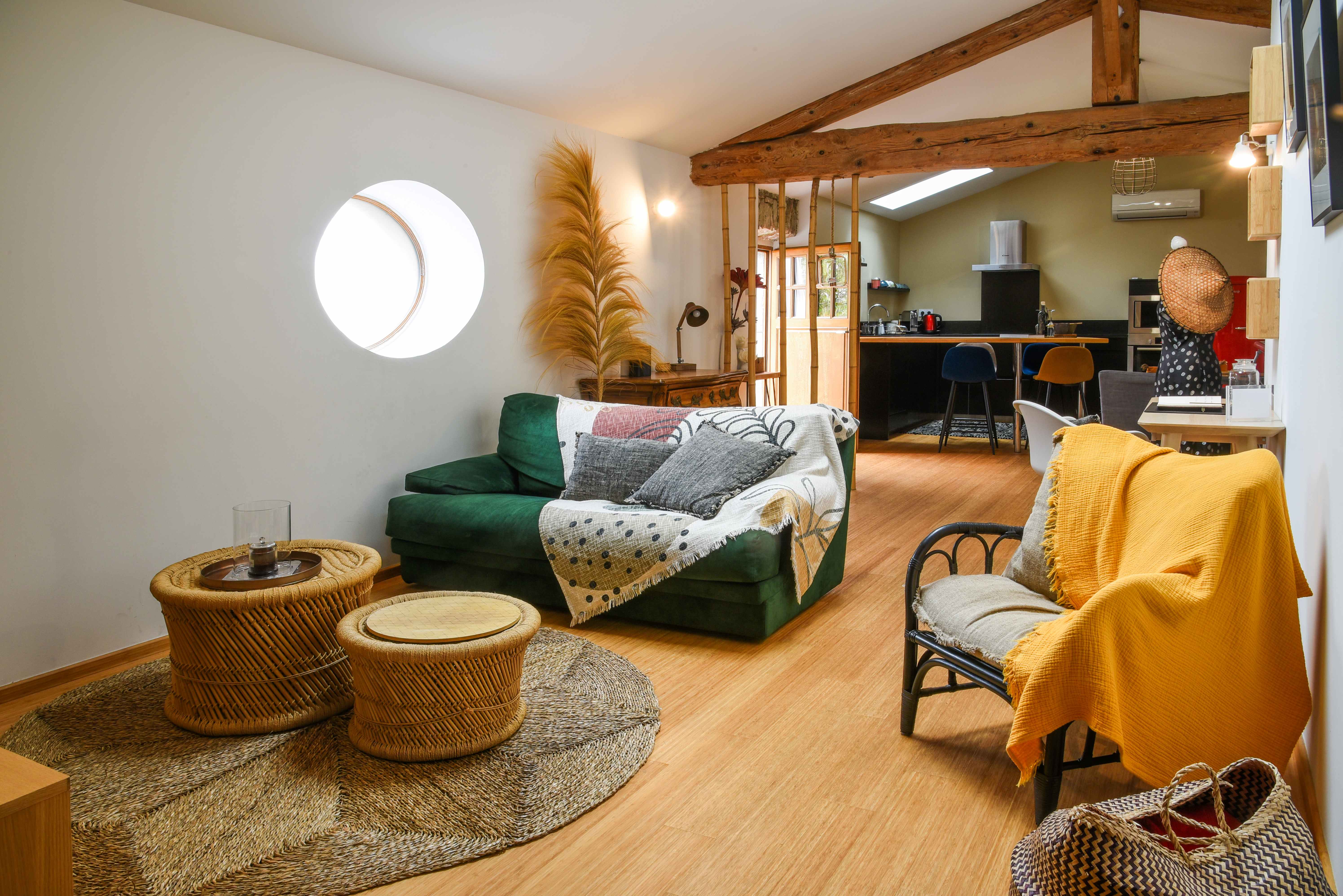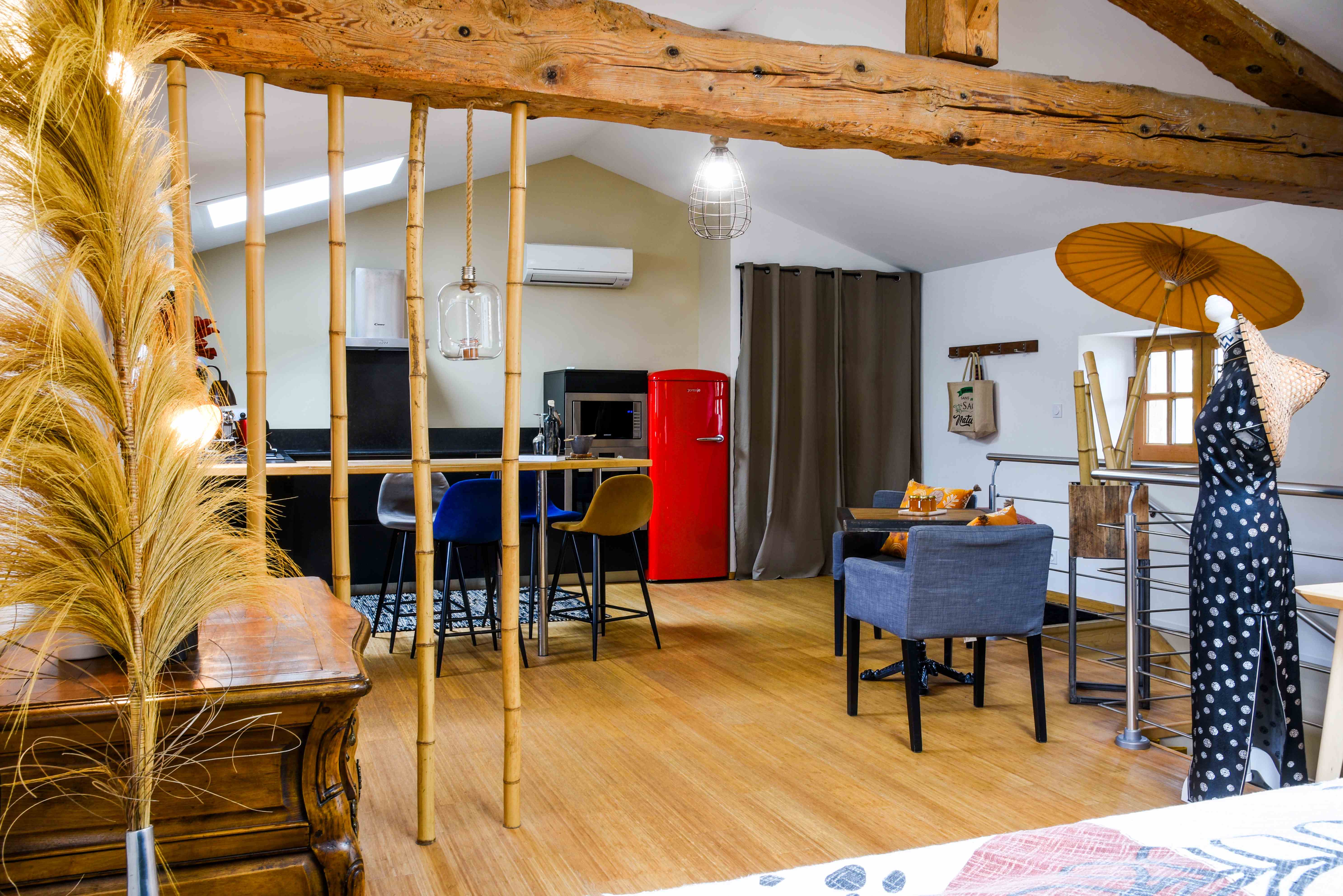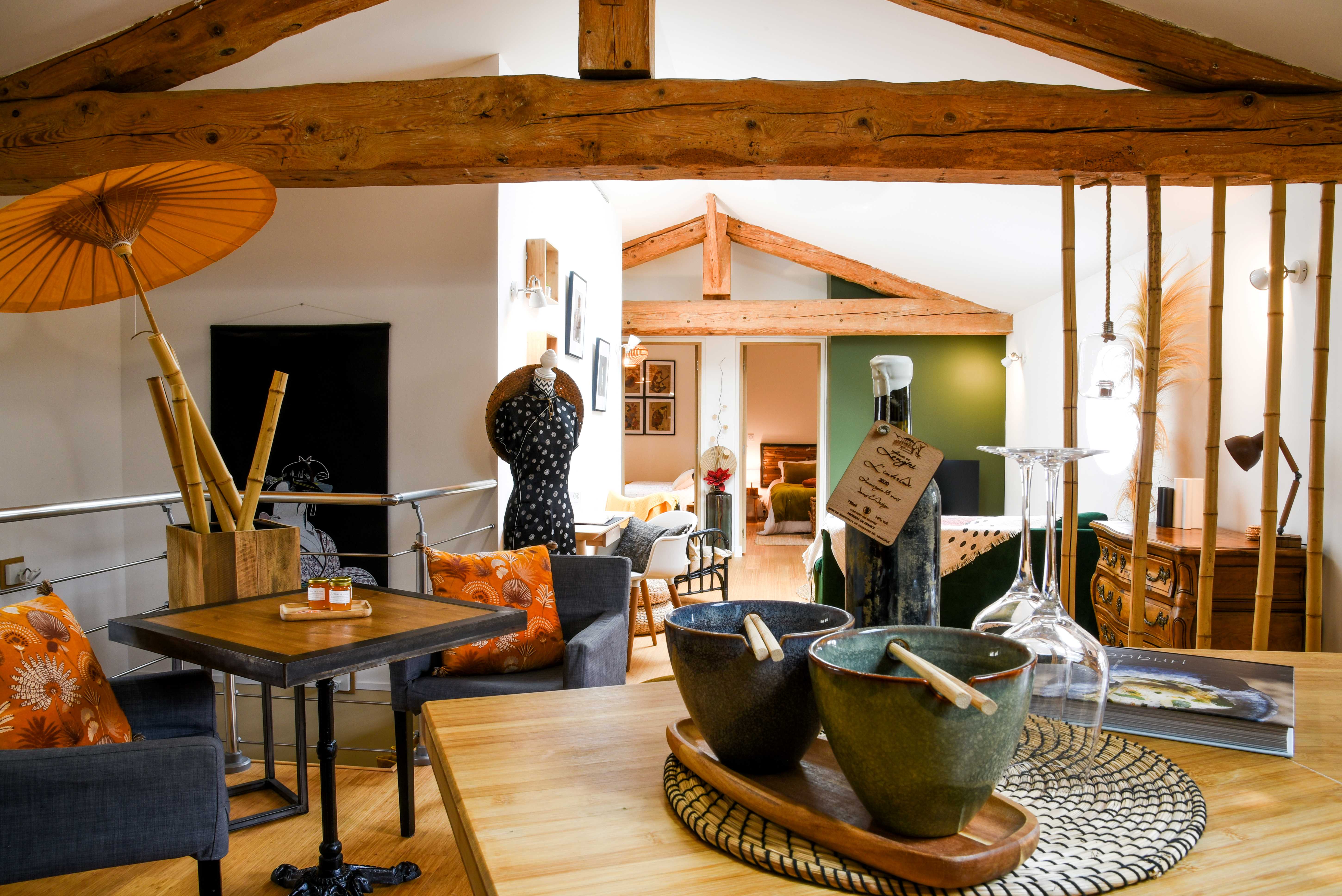Dès l’entrée, on est séduit par l’ensemble qui combine un restaurant à l’atmosphère chaleureuse, une touche asiatique mêlée aux produits locaux, un jardin clos avec une piscine privée et votre location de vacances. Le sol en bambou, les poutres apparentes et la terrasse, idéale pour prolonger les moments de détente, ajoutent à l’attrait du lieu. L’accès à la bâtisse se fait par un porche, où se trouve une entrée indépendante et sécurisée au rez-de-chaussée. Ce gîte offre une expérience autonome et intime.