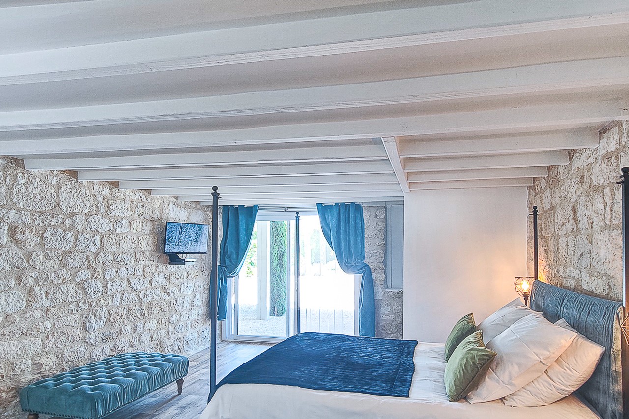 The 35 m² rooms are spacious and fresh with stone walls, all on garden level, each with its own entrance to the garden and view of the pool, quality bedding, full bathroom, TV in each room, high-speed wifi.