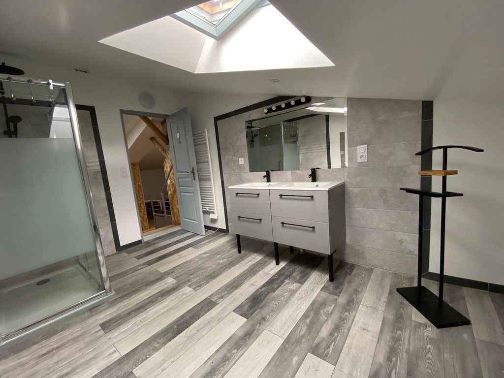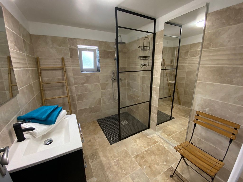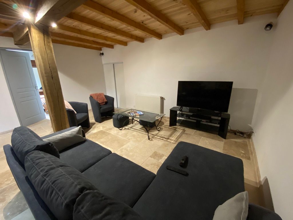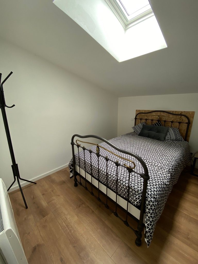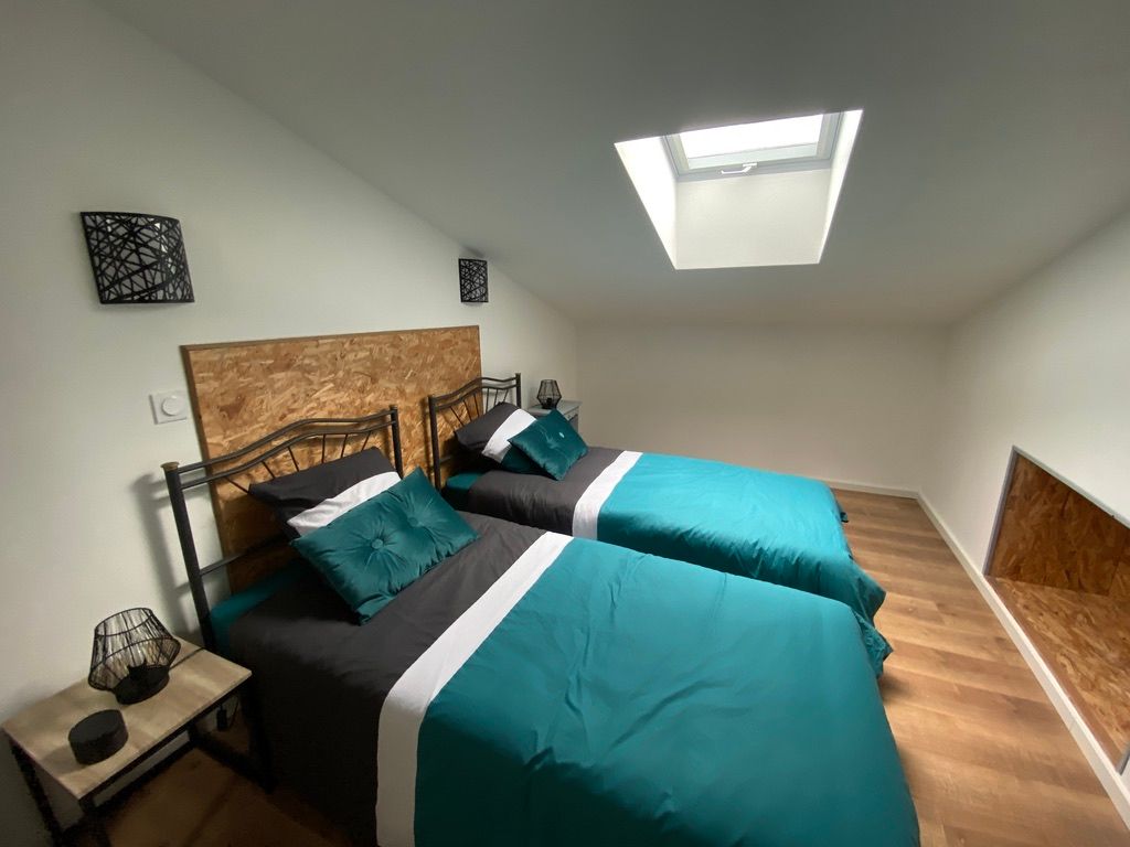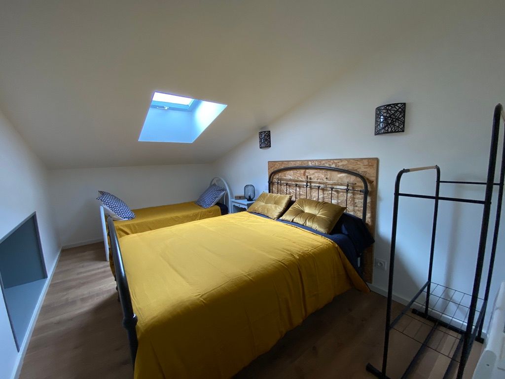 The ground floor comprises a living room with fitted kitchen (fitted units with dishwasher, fridge, freezer, microwave, hob and oven), a dining area (table and chairs), opening onto a lounge (corner sofa and two armchairs and two footstools, TV). There is a bedroom (2 x 0.90cm beds), a shower room (walk-in shower, 1 washbasin) and a separate toilet. Upstairs, a large mezzanine with a study area, an additional sitting area (TV and sofa), 4 steps to the bedroom (2 single beds), 2 steps to the bedroom (1 double bed and 1 single bed), 3 steps to the bathroom (double shower), a separate toilet and a bedroom (1 single bed). The 3 upstairs bedrooms have velux windows and blackout blinds. Wifi in the accommodation. Sheets and towels provided as an optional extra.