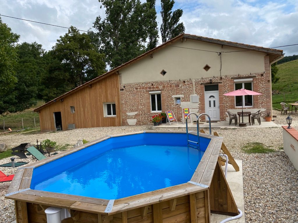 Outside, terrace with garden furniture, a second set of garden furniture near the barbecue. Sun loungers and above-ground swimming pool (5.50 x 3.50, depth 1.20). Outbuilding with washing machine. Gravelled courtyard.