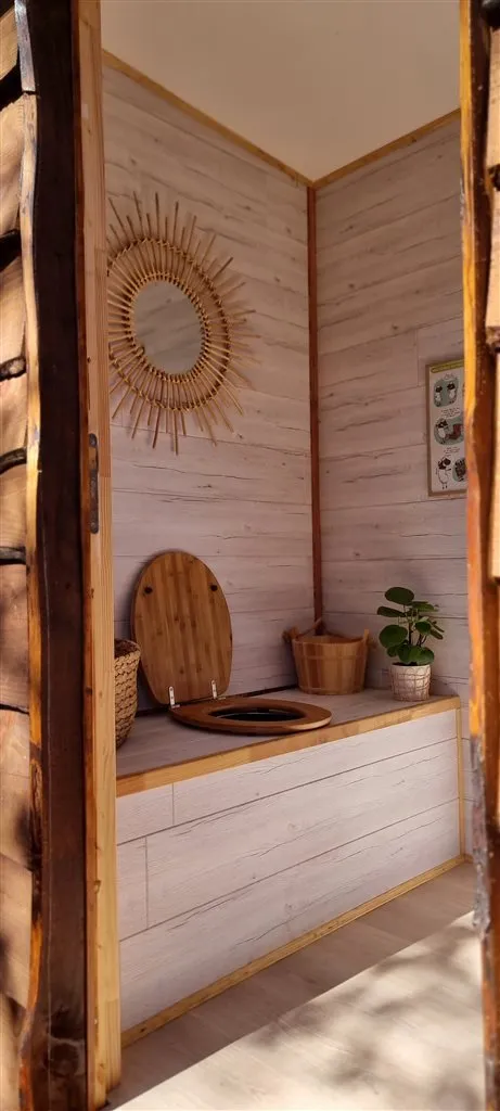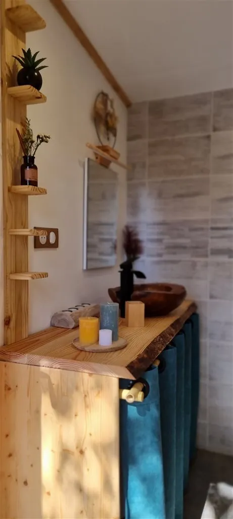 Espace “nuit” : 1 lit 160 – Espace “salle d’eau” dans un bâti à côté : lavabo, douche, wc (toilettes sèches) et sèche-cheveux – Terrasse (15m²) privée avec salon de jardin, vue sur les bois et les vignes permettant de prendre le petit-déjeuner ou le dîner.