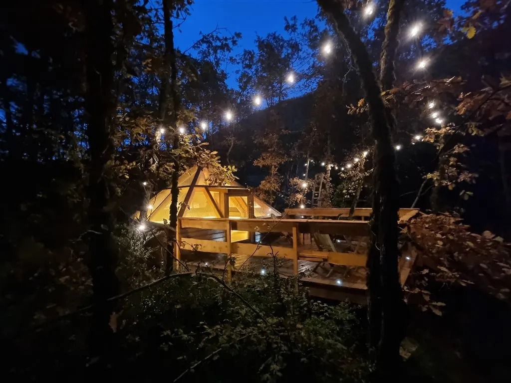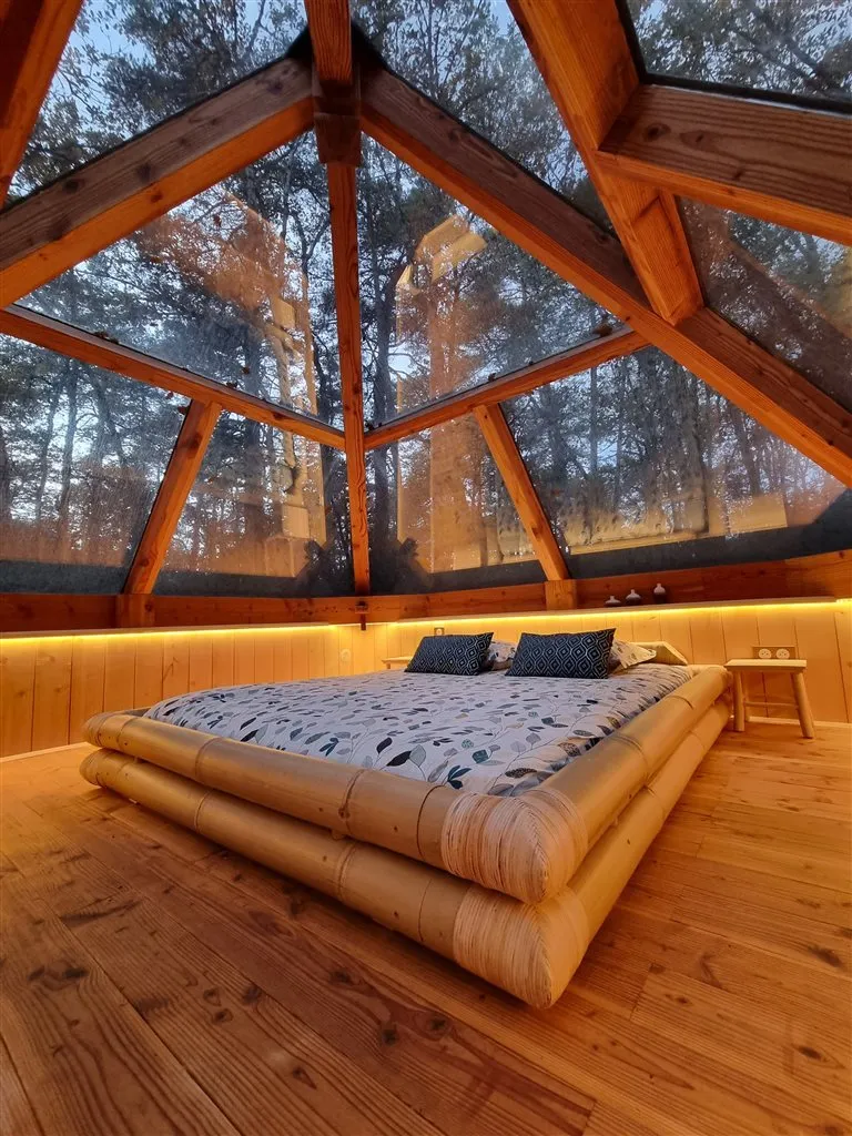 Chambre d’hôtes aménagée dans une pyramide de verre et de bois au milieu de la nature