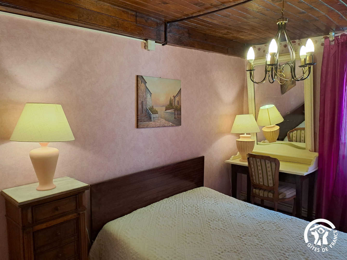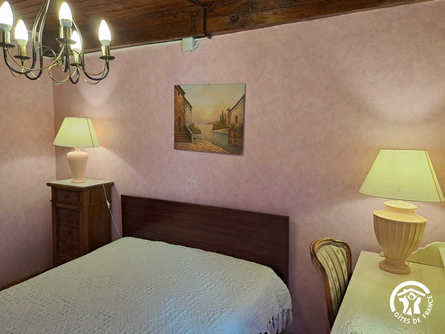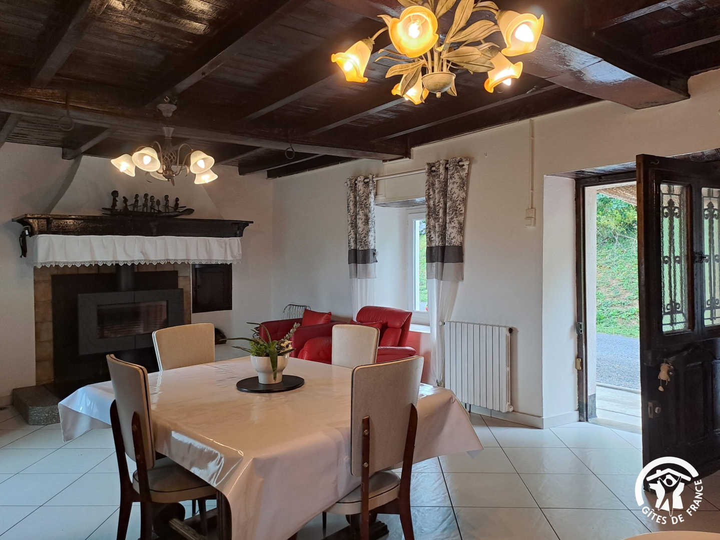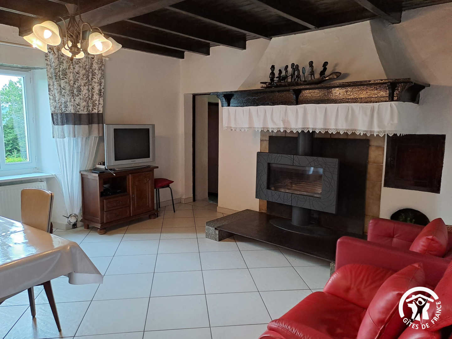 Indep.gîte in a hamlet. Gr. fl.: kitchen, dining-rm, lounge (1 double bd, sofa-bd), shower-rm, WC. 1st fl.: 2 bdrms (2 double bds), baby bd on request. Gas central heating. Washing mach., freezer, micro-wave, library, TV. Grounds, greenery around the house (5,6 ha), lawn, terrace, garden table & chairs, BBQ. Poss. bed linen renting, cleaning service. O