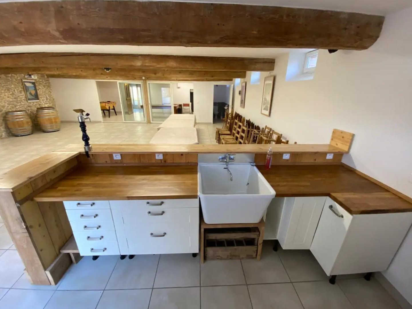 – La cuisine : four, lave-vaisselle, réfrigérateur avec congélateur, cafetière, bouilloire, grille-pain, micro-ondes, mixeur… La vaisselle pour 25 personnes se trouve dans la grande salle.