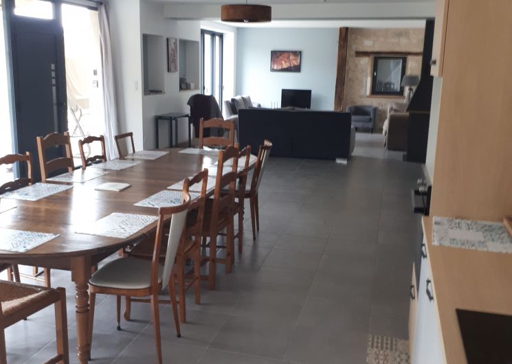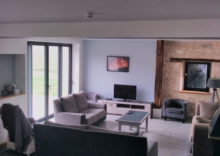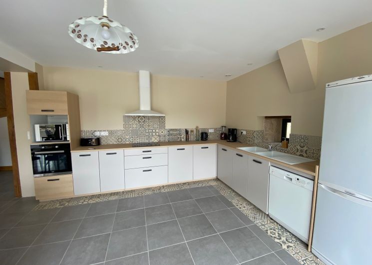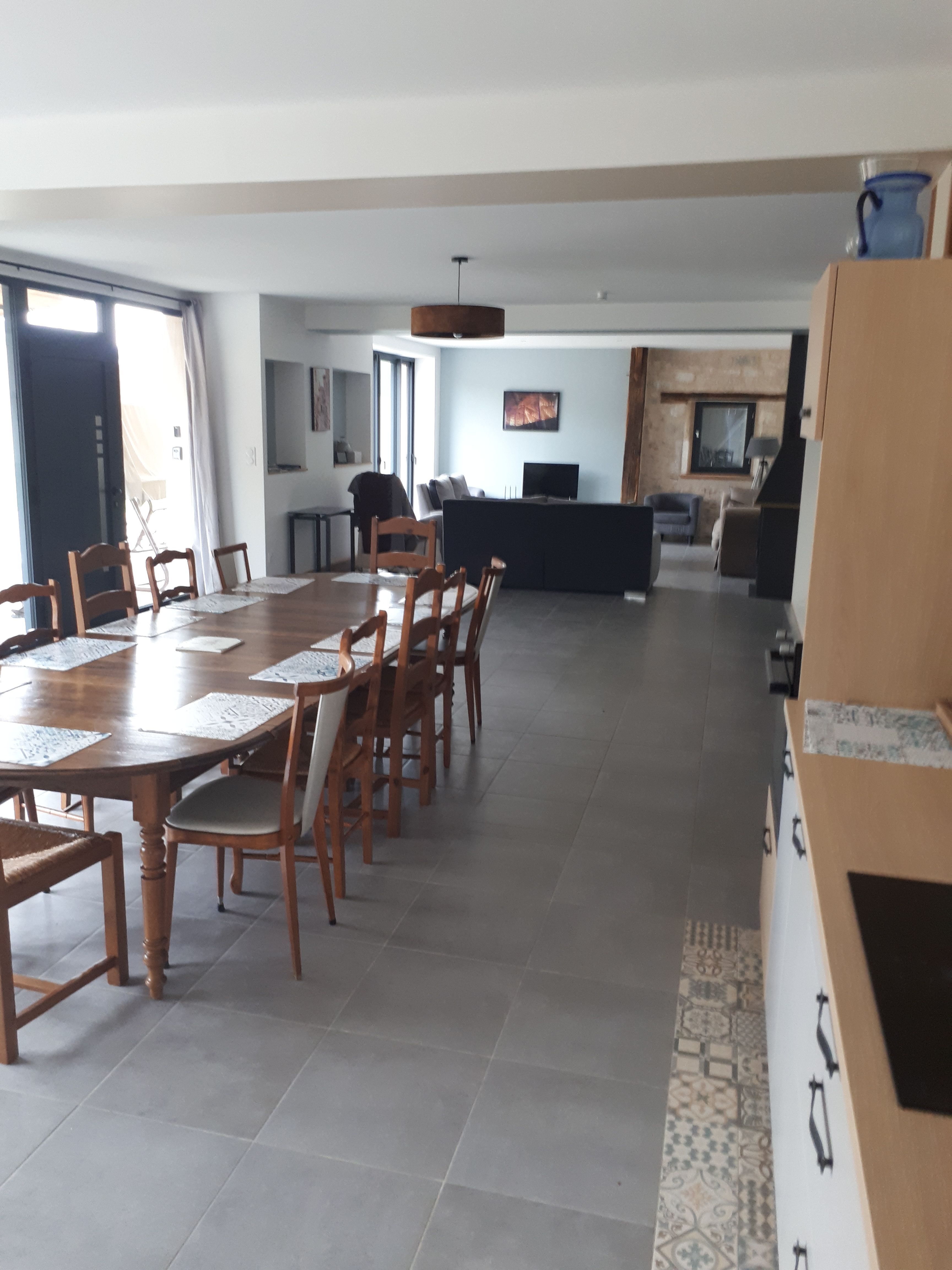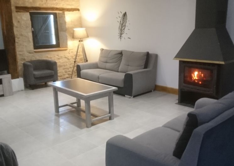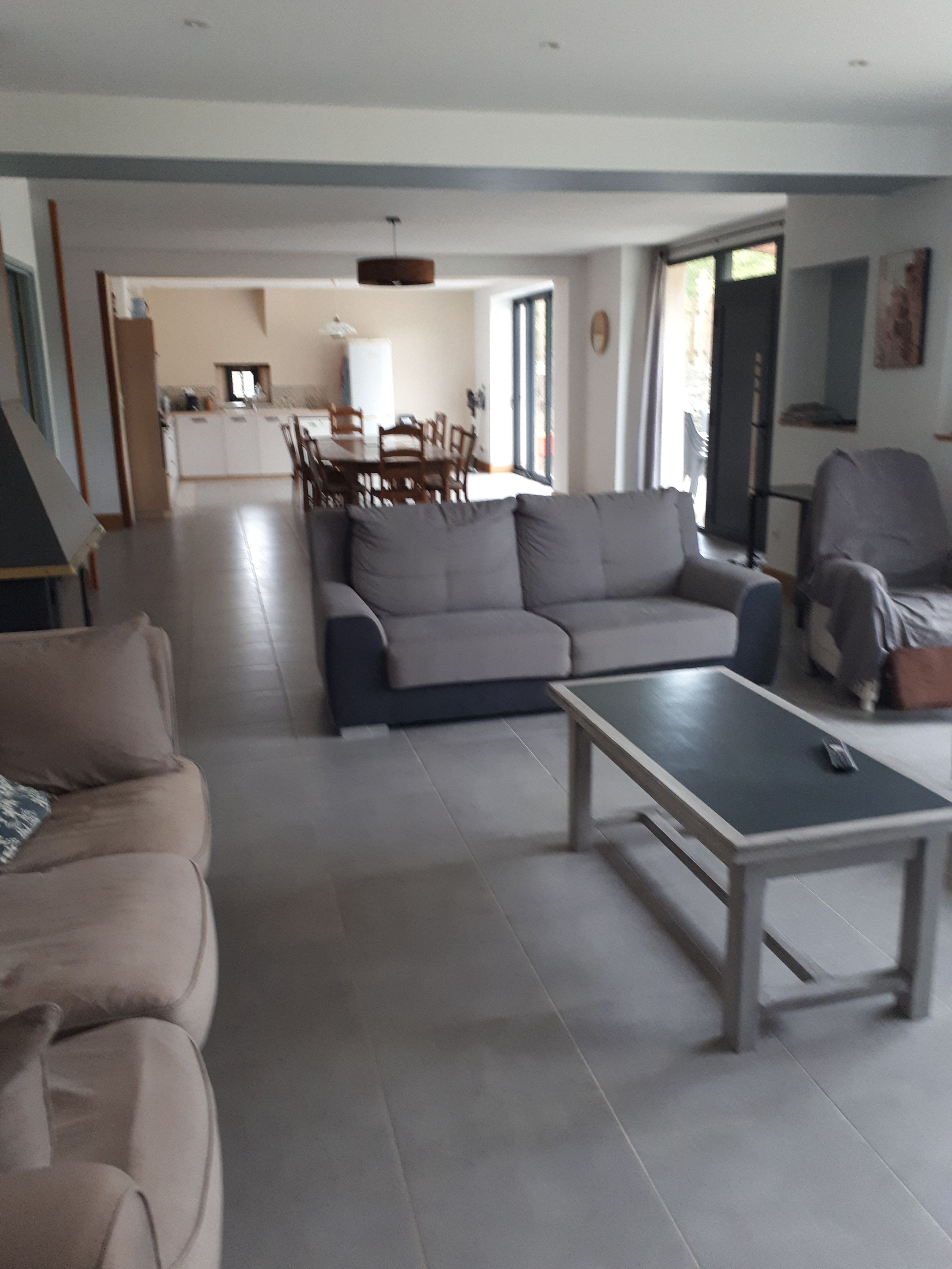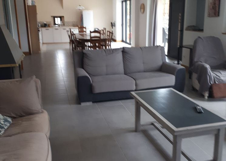 Ground floor: large living room with lounge (3 sofas, 3 armchairs, coffee table, TV, wood-burning stove), fitted kitchen (dishwasher, microwave, freezer, fridge, oven).