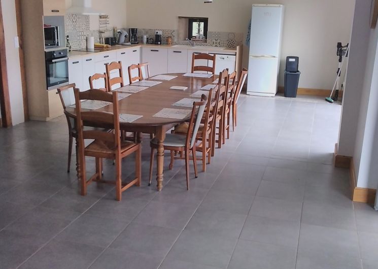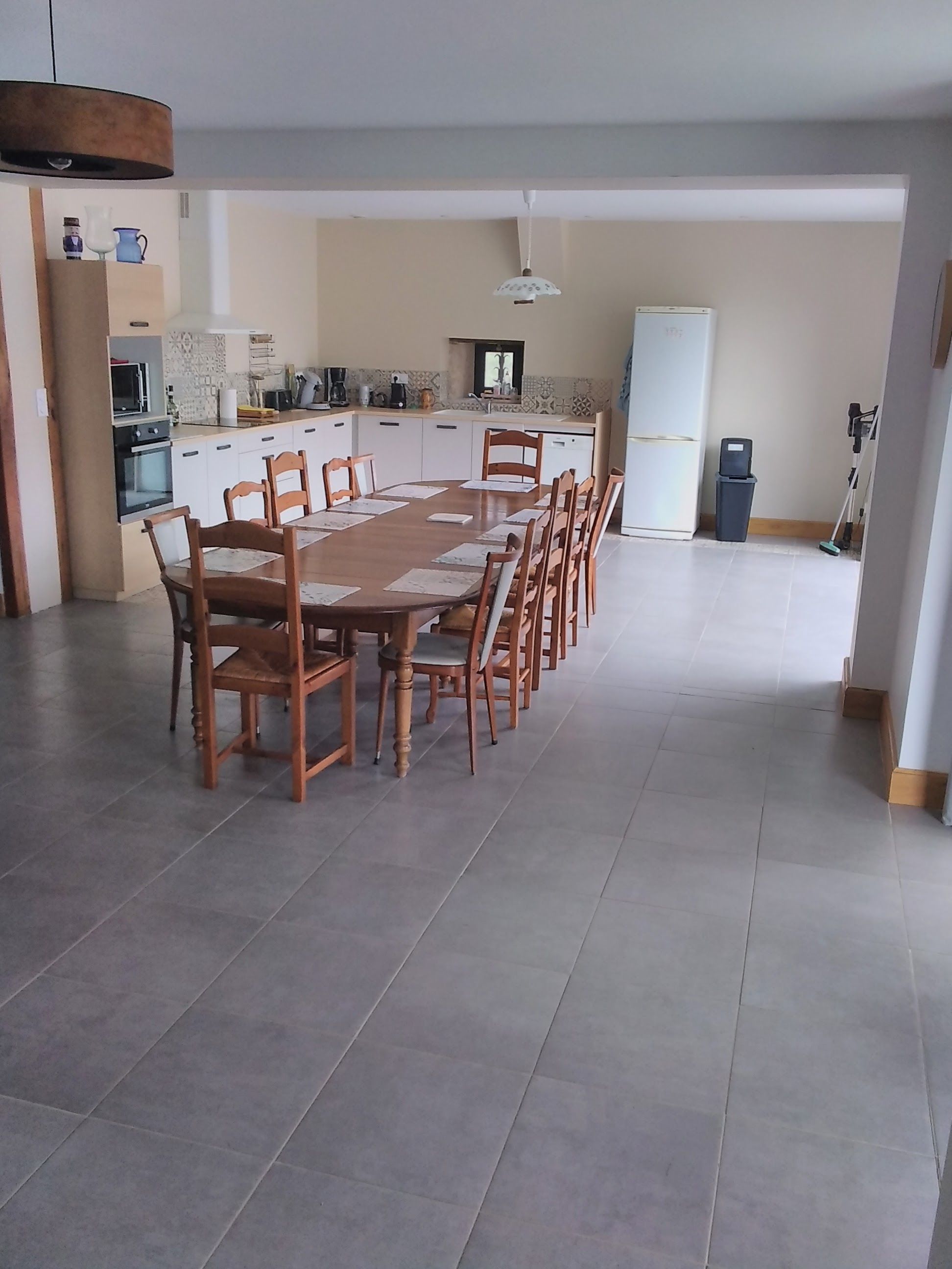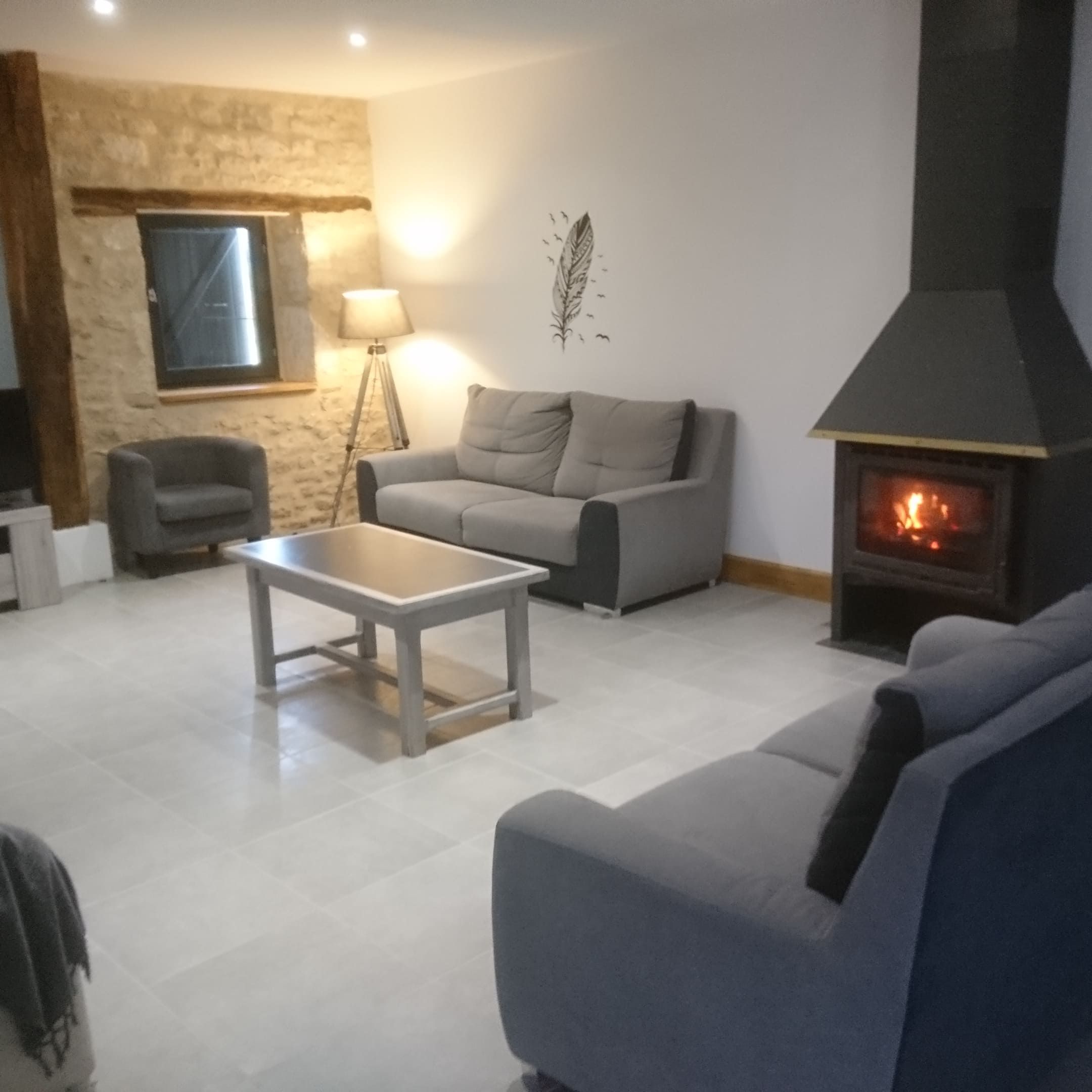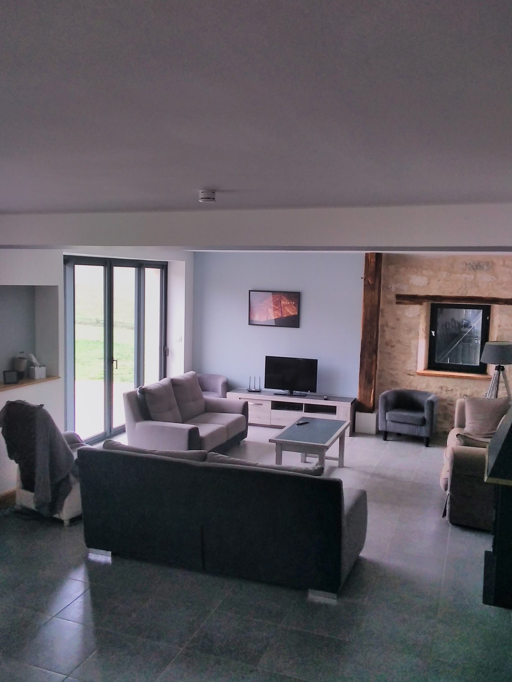 Ground floor: large living room with lounge (3 sofas, 3 armchairs, coffee table, TV, wood-burning stove), fitted kitchen (dishwasher, microwave, freezer, fridge, oven).