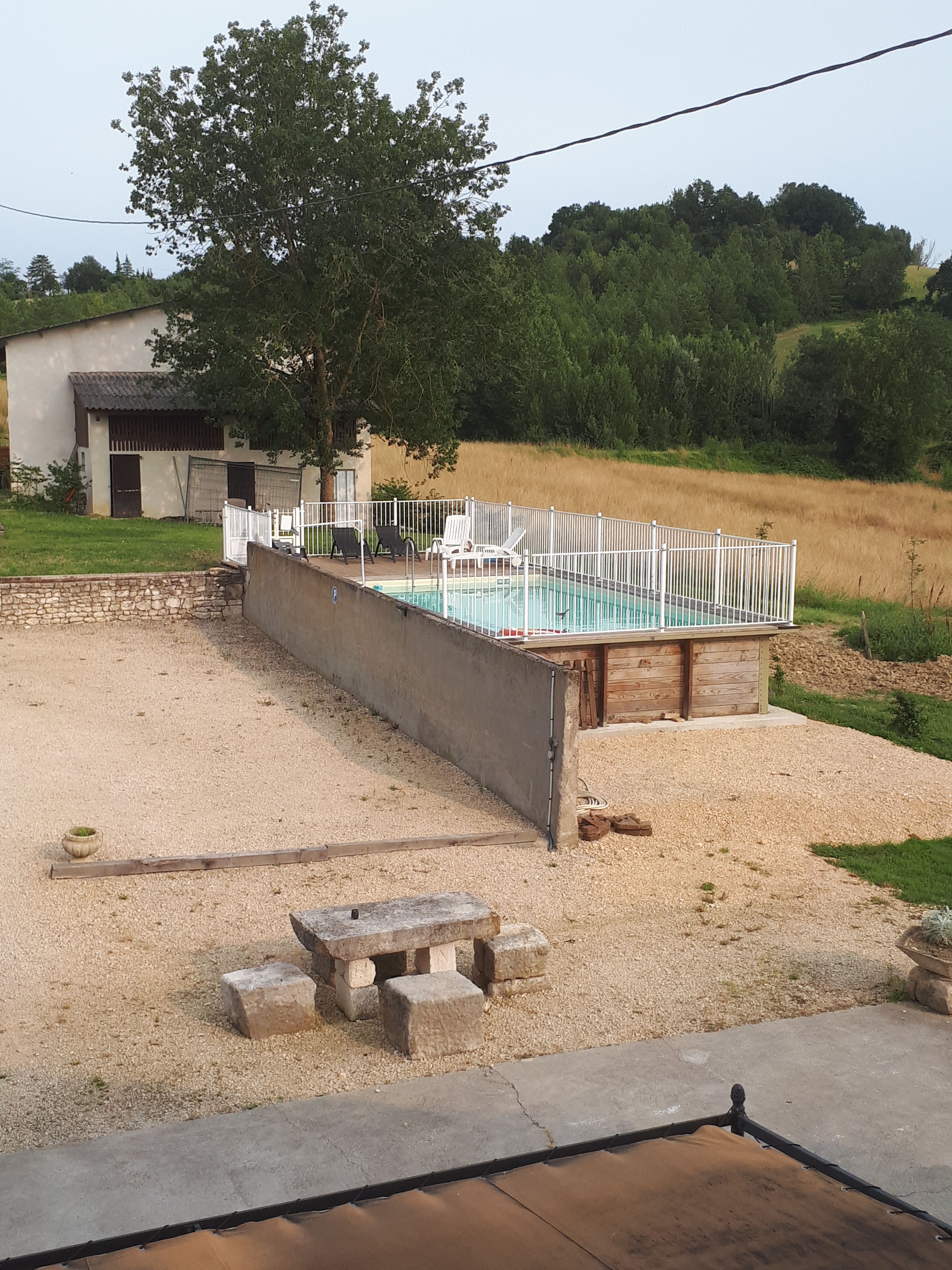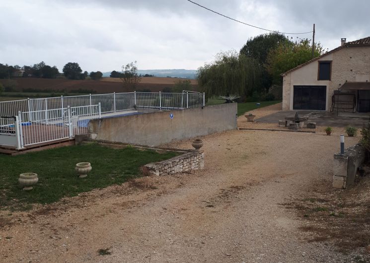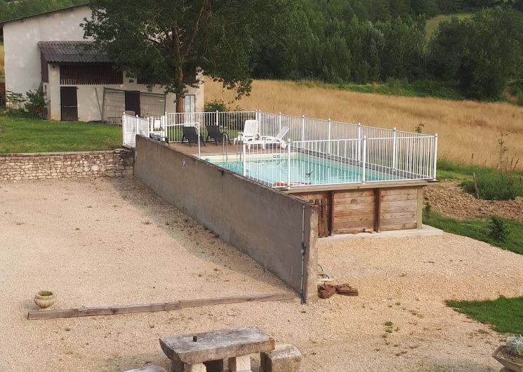 Large, partly covered terrace with garden furniture, 3 sun loungers and barbecue. Above-ground swimming pool (8×4) with beach. Boules pitch, parking in front of the house.