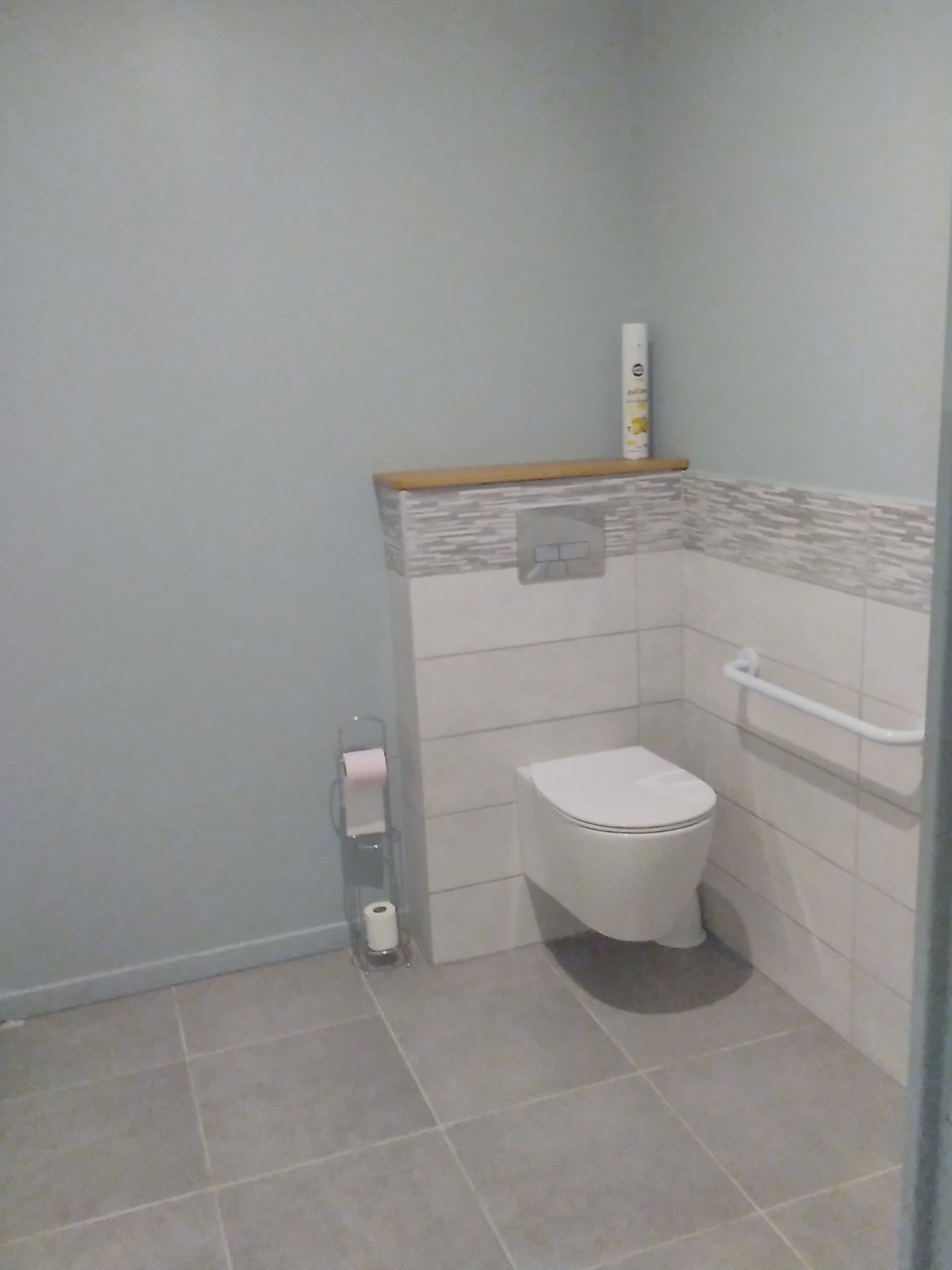 A toilet with washbasin (accessible to people with reduced mobility), a storeroom (washing machine, second top),