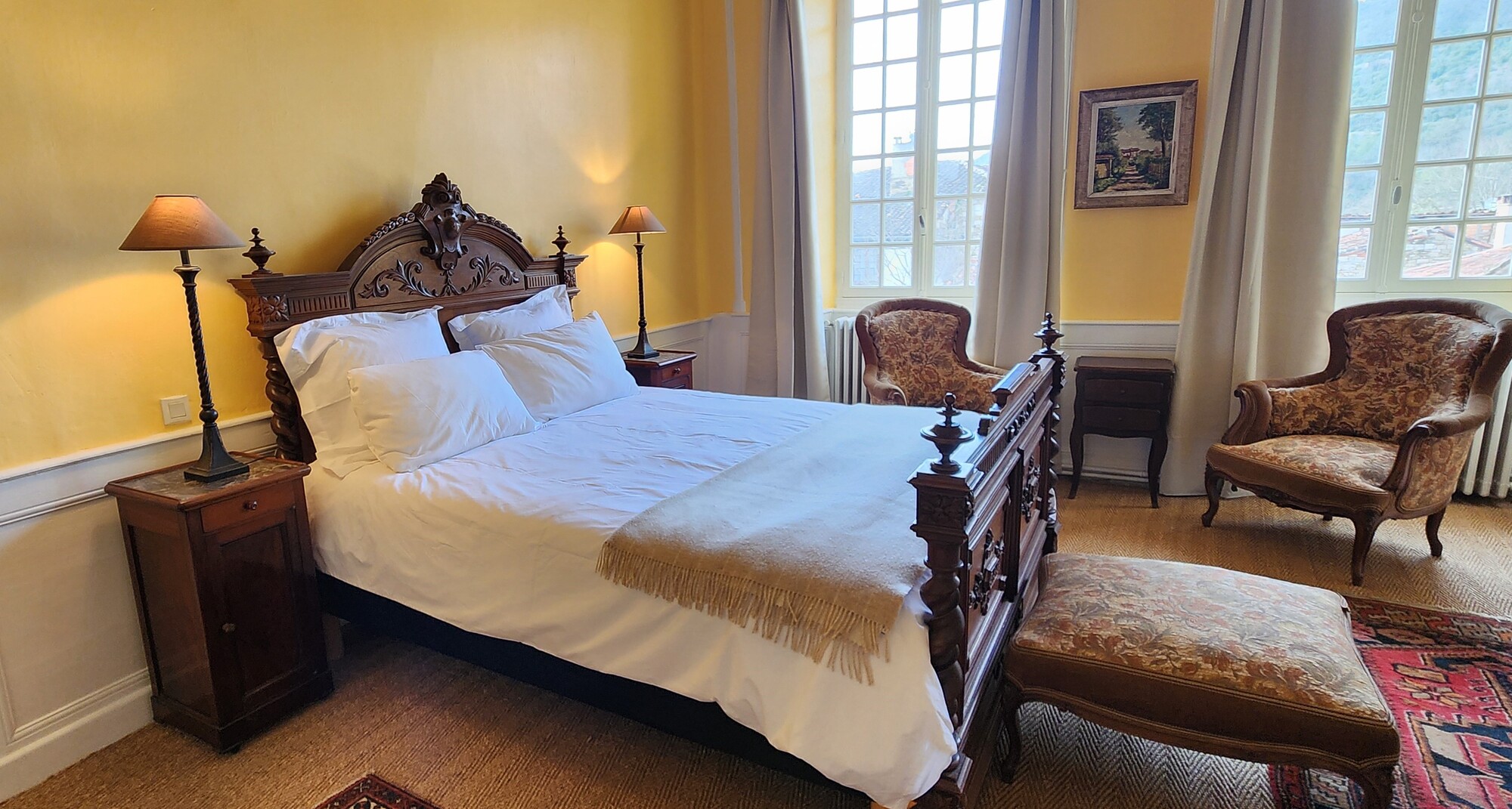 Une grande chambre élégante de 32m2 avec un lit en peluche de 160 x 200 située au premier étage. Cette suite donne sur la rue médiévale et son célèbre marché du dimanche. La salle de bains est équipée d’une baignoire, d’une douche, d’un lavabo et de toilettes.