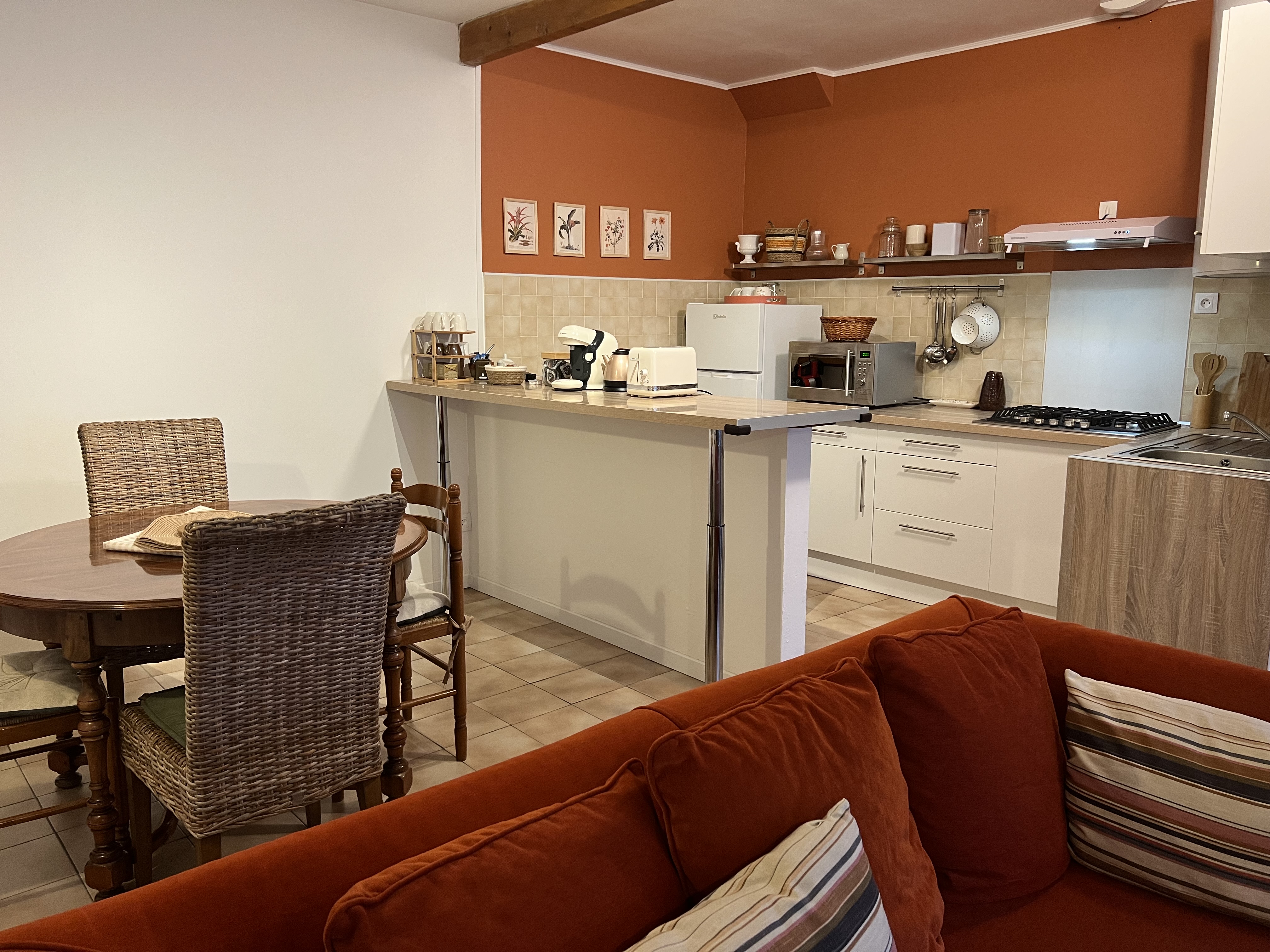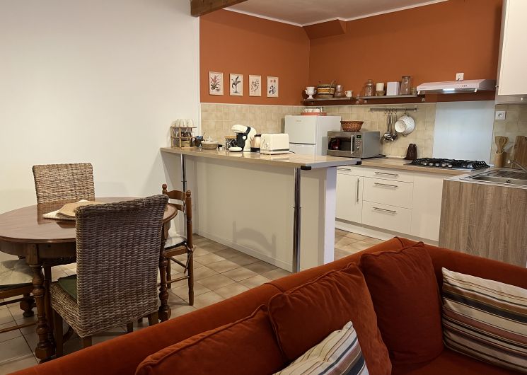 Un séjour avec une cuisine équipée au rez-de-chaussée.