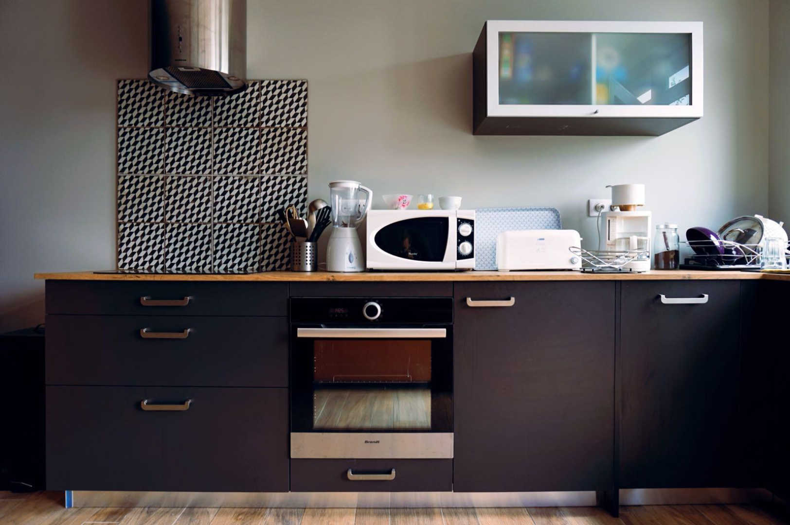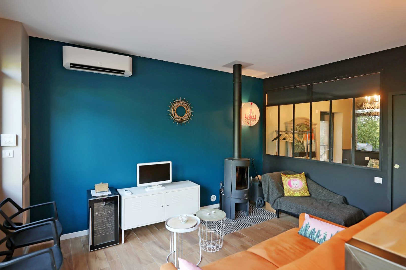 Séjour avec coin cuisine ouverte sur table à manger en hauteur, espace canapé convertible avec son poêle à bois et TV. Cuisine équipée d’un four, petit lave-vaisselle, micro-ondes, bouilloire, cafetière à filtre, grille-pain et blender. Climatisation réversible.