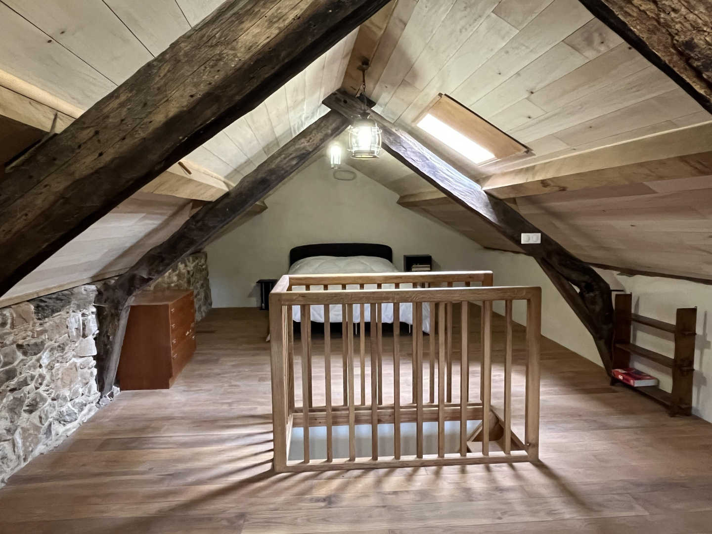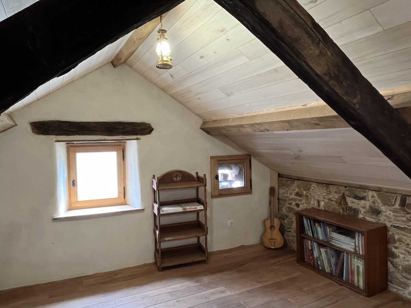 Au grenier, chambre 3 (30m²) : partie dortoir et partie salle de jeux avec 2 lits de 80×190 (ou 1 lit de 160×190), banquette, meubles de rangements