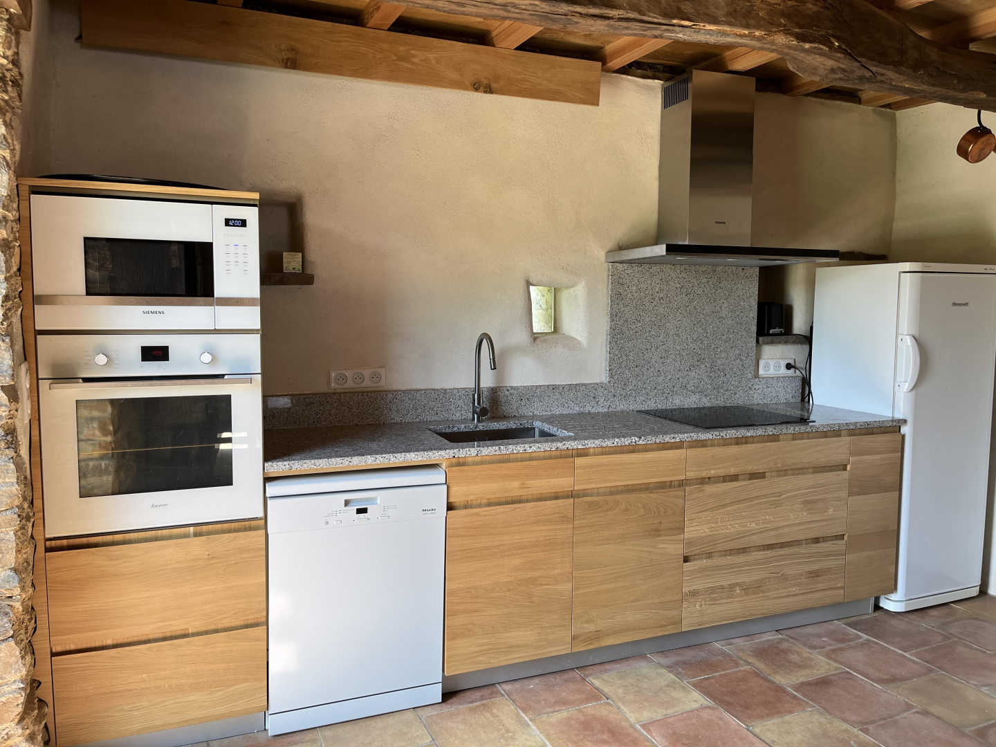 Rez-de-chaussée : séjour 40m² (table avec 6 chaises, vaisselier, banquette et 2 fauteuils, table de jeux, télévision, wifi), cuisine équipée contemporaine avec lave-vaisselle, four, micro-ondes, réfrigérateur-congélateur, batterie de cuisine et vaisselle, pièce wc avec lave-linge.