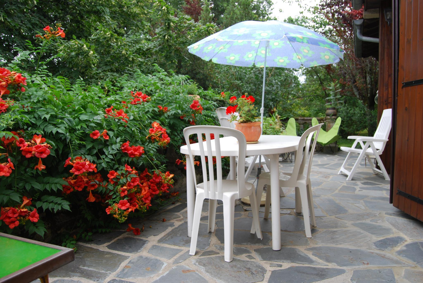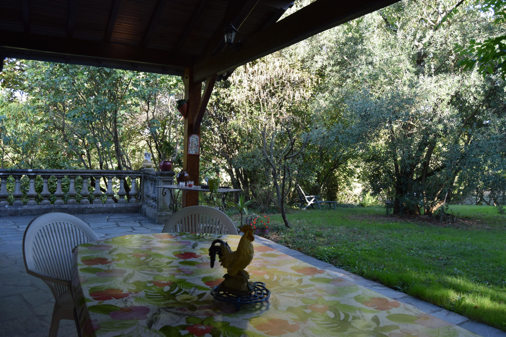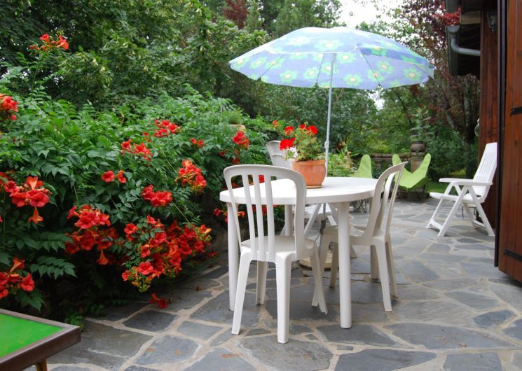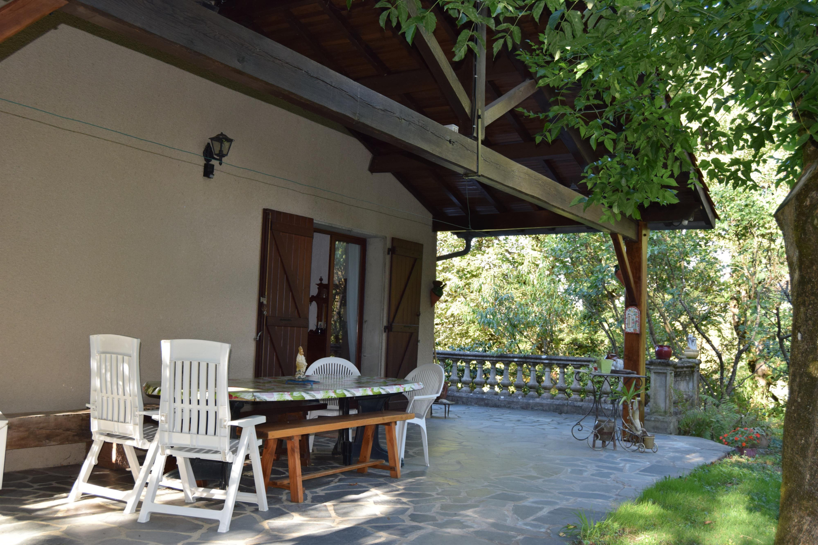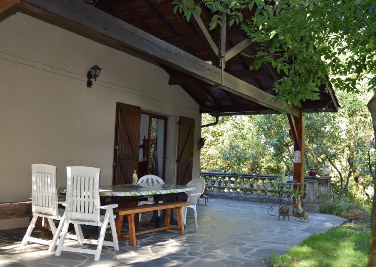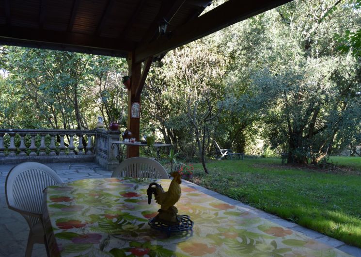 – Extérieurs : une terrasse entoure la moitié de la maison, ouverte au niveau du séjour avec salon de jardin et barbecue au charbon de bois. La maison est entouré d’environ 6000m² de terrain, arboré, fleuri, ombragé ! Parfait pour se prélasser pendant l’été.