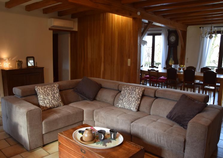 – Cuisine ouverte sur le grand séjour avec cheminée, canapé, tv. Le séjour est climatisé et comme la maison est de plain-pied, les chambres se rafraichissent facilement.