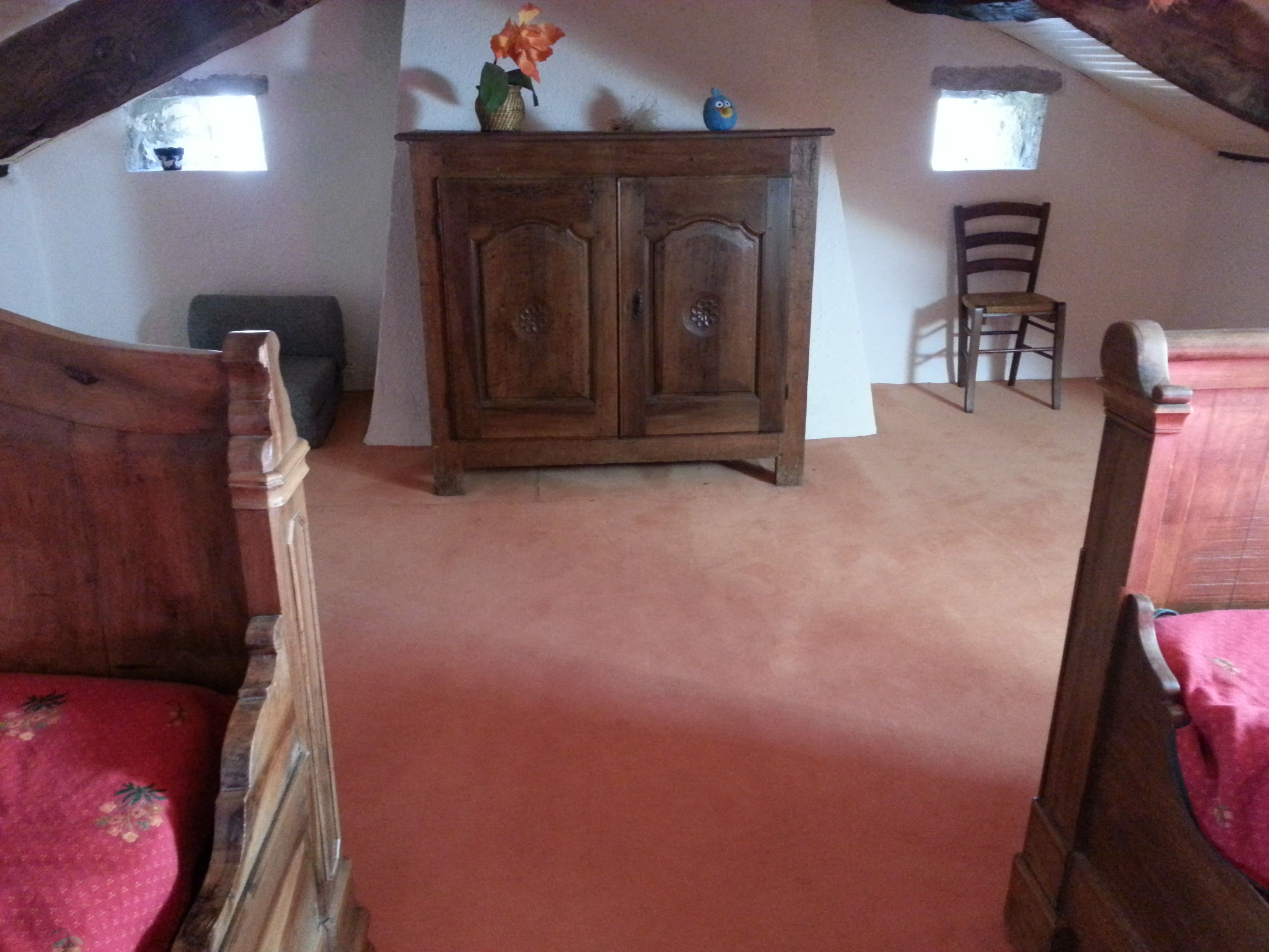 In a hamlet, independent gite. Ground floor: living room (fireplace, 1 sofa, 2 armchairs) with kitchen area (integrated elements, MW, DW, LL), 1 bedroom (1 double bed), 1 bedroom (1 single bed), shower room, wc . Upstairs 1 bedroom with sloping ceilings (2×120). Enclosed private garden (500 m2), barbecue, garden furniture, 5 garden relaxers. Electric heating.