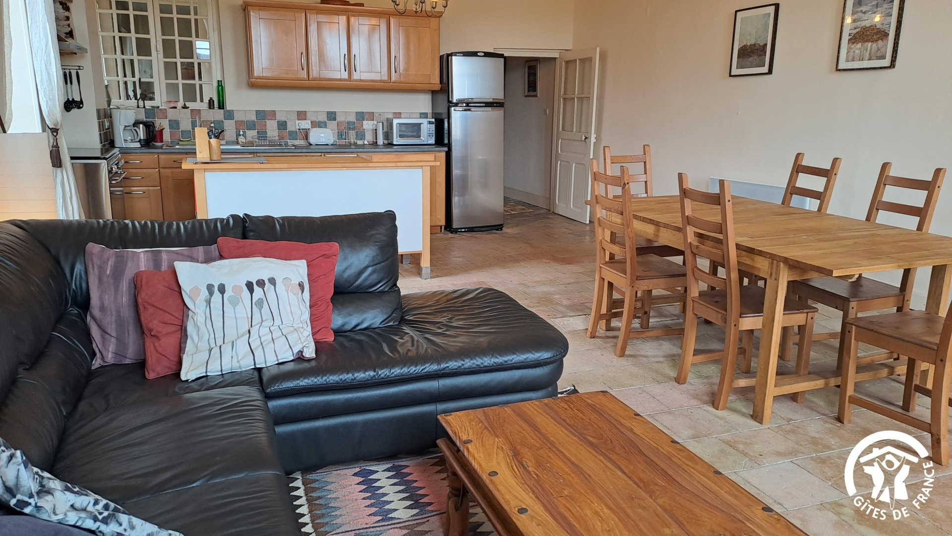 A ce niveau se trouve un grand séjour/cuisine entièrement équipée : piano de cuisson, micro-ondes, bouilloire, grille-pain, cafetière à filtre… Coin salon avec canapé d’angle et TV par la tnt parabole. Wifi non disponible mais la 4G fonctionne bien en fonction des opérateurs.