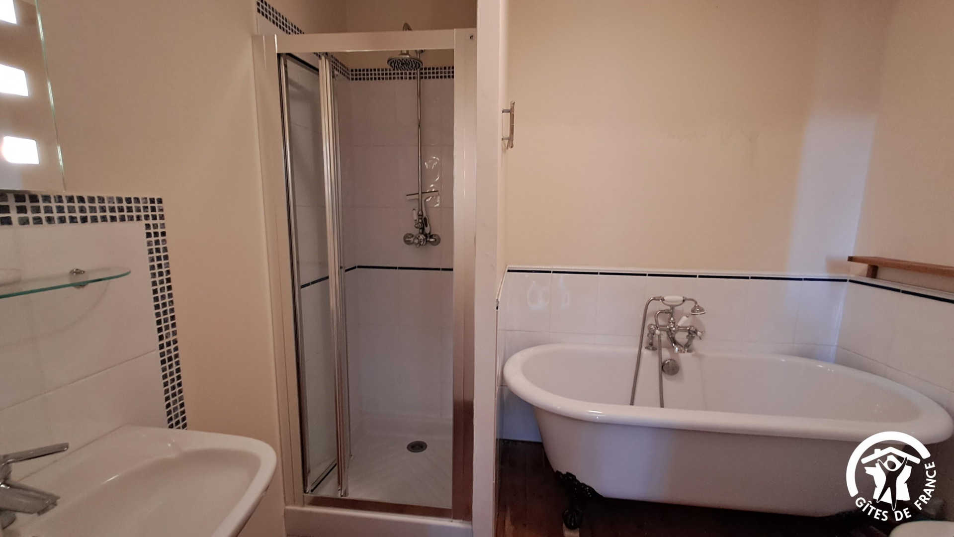 Salle de bain avec douche, baignoire à pieds, lavabo et wc. A noter qu’il n’y a pas de prise dans la salle de bain.