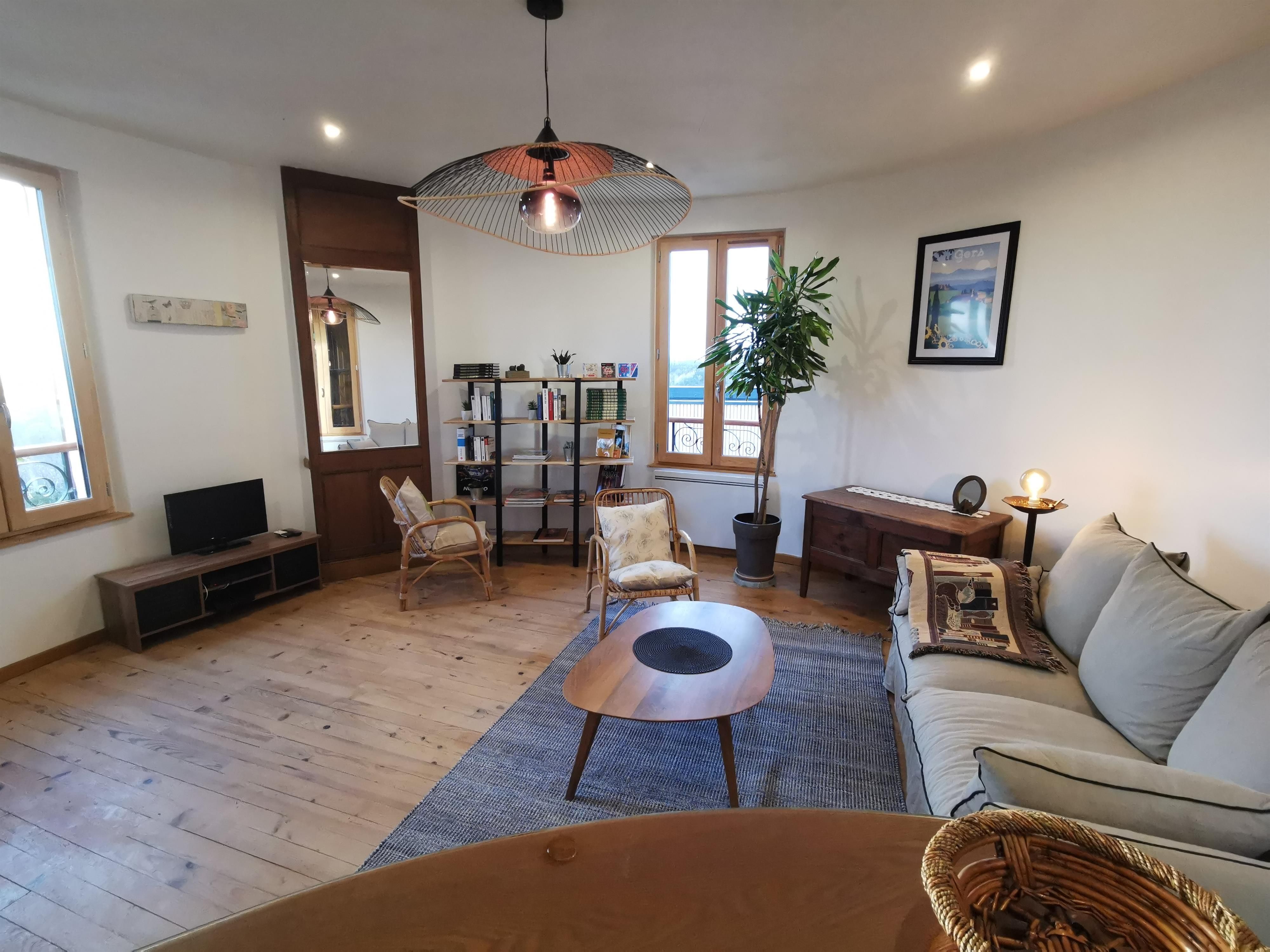 Le mur du rez-de-chaussée a été creusé pour aménager une cuisine équipée et fonctionnelle avec un espace repas. La salle d’eau ceinte d’un claustra est intégrée à la chambre, composée d’un lit double en 140. Au dernier étage du moulin, vous trouverez un salon panoramique de 26m², avec un canapé convertible de qualité, une tv, un bar, une bibliothèque (livres sur le Gers, des romans, des livres sur l’art). Depuis le salon, vous pourrez y admirer la vue exceptionnelle sur Auch et sa cathédrale ainsi que les Pyrénées par temps clair.