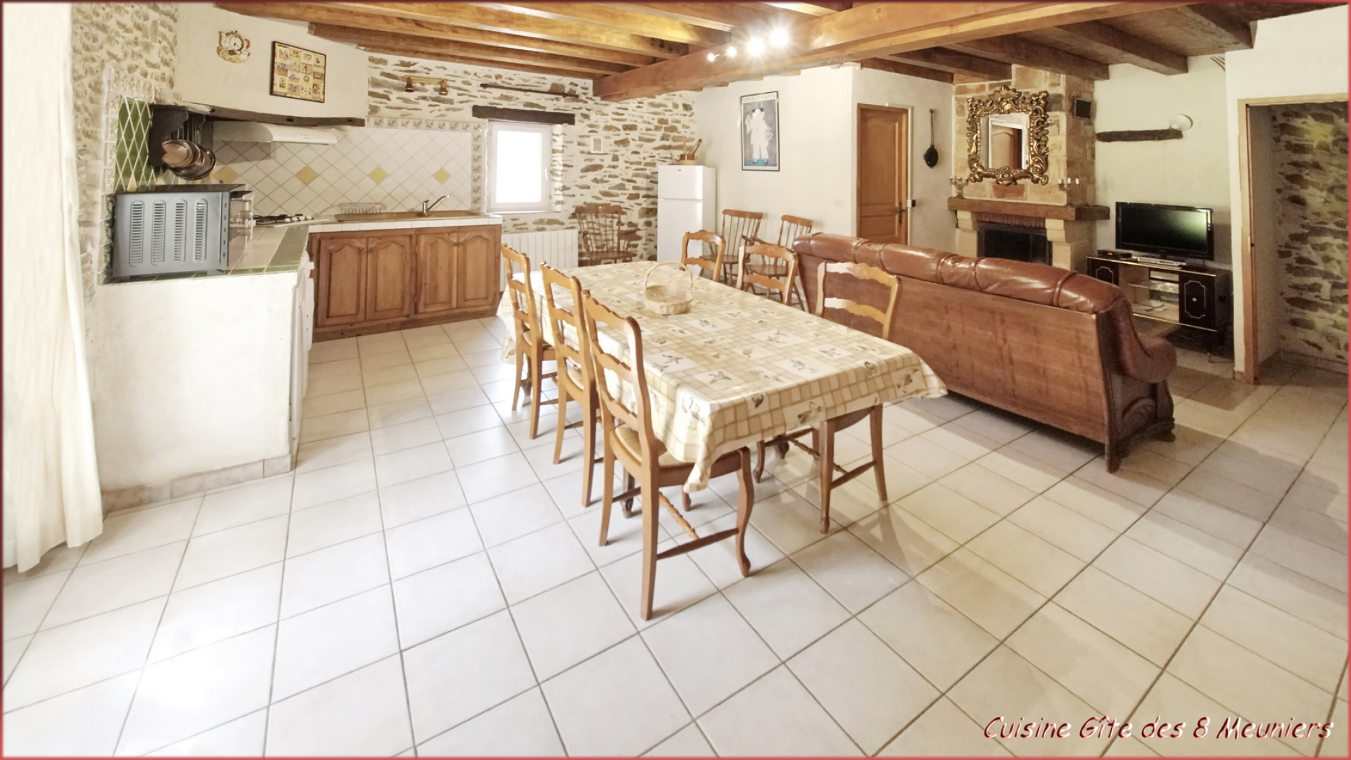 • Gîte des 15 Meuniers: a large living area with fully equipped open kitchen (oven, microwave, dishwasher, fridge-freezer, vitroceramic hob, filter coffee maker), dining area and lounge with fireplace and TV.