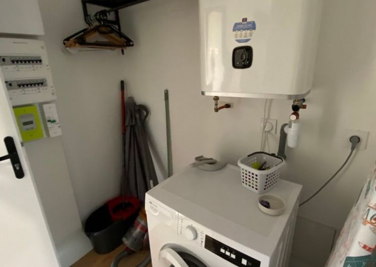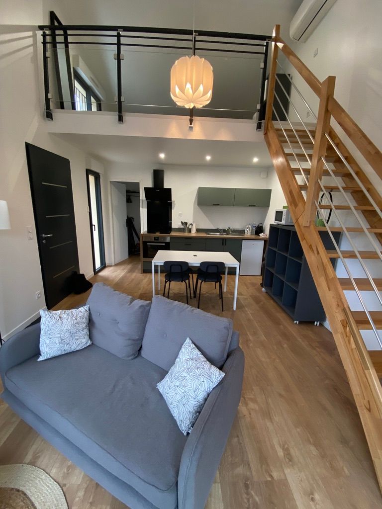 After the enclosed terrace with its garden furniture, the ground floor is decorated in soft shades of green, with wood for a warm, relaxing ambience. The living area comprises a lounge with sofa and TV, a dining area (table and chairs) and fitted kitchen units (oven, microwave, fridge with freezer, hob and extractor fan). There is a utility room with a washing machine and a shower room with WC. Upstairs, on an unenclosed mezzanine overlooking the living room, is a bedroom with a large attic (1 x 160cm bed). Bed linen, towels and household linen included in the price. Wifi throughout. Netflix included. Private parking on site. Fully air-conditioned.