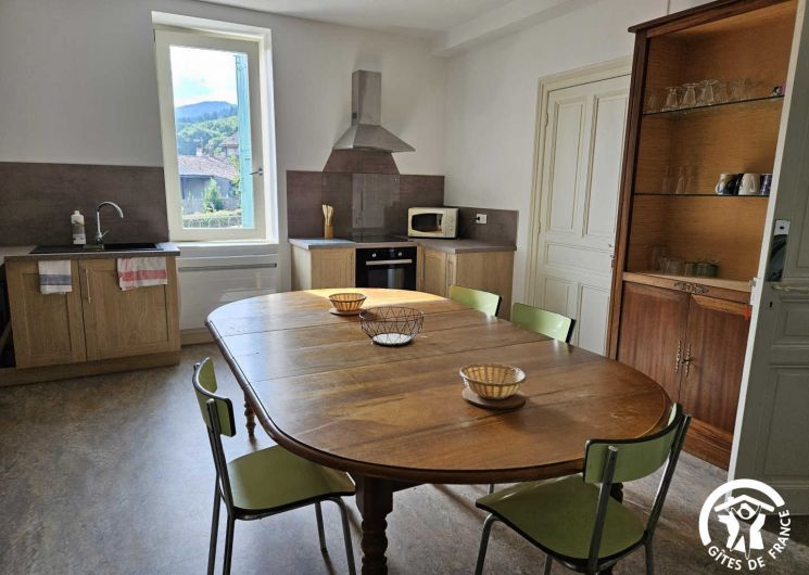 – pièce à vivre avec cuisine ouverte (réfrigérateur/congélateur, four, plaque induction 4 feux, petit électroménager : cafetière, bouilloire, grille-pain…), grande table, coin salon (canapé, fauteuils), poêle à granulés