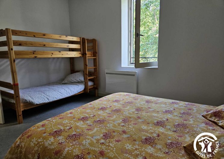 – grande chambre pour trois personnes, lit double en 140x190cm + lit simple en 90x190cm, vue sur la montagne et le jardin